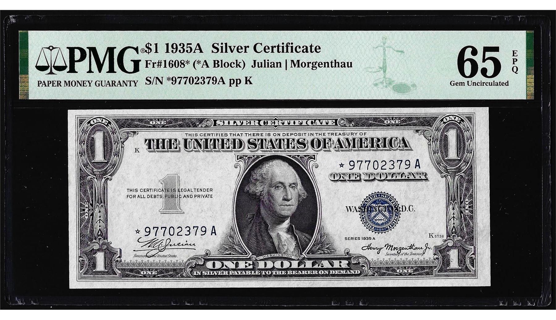 One 1935A $1 Silver Certificate STAR Note Fr.1608* PMG Gem Uncirculated 65EPQ.