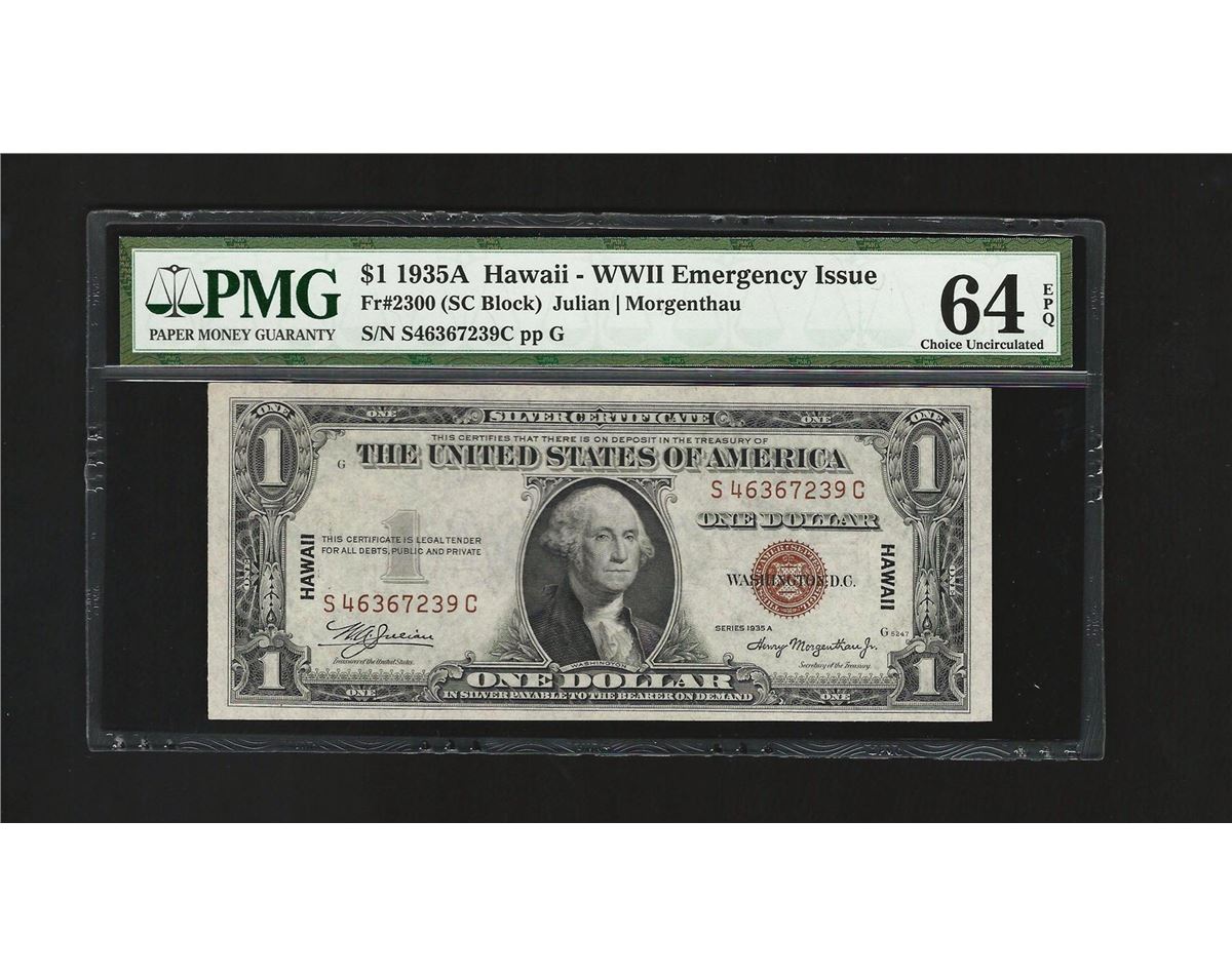 One 1935A $1 Silver Certificate WWII Emergency Hawaii Note PMG 64EPQ. PMG Certified.