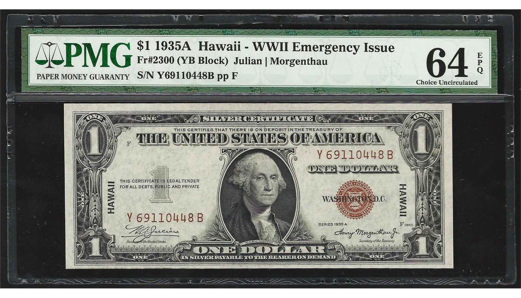 One 1935A $1 Silver Certificate WWII Emergency Hawaii Note PMG Choice New 64EPQ. PMG Certified.
