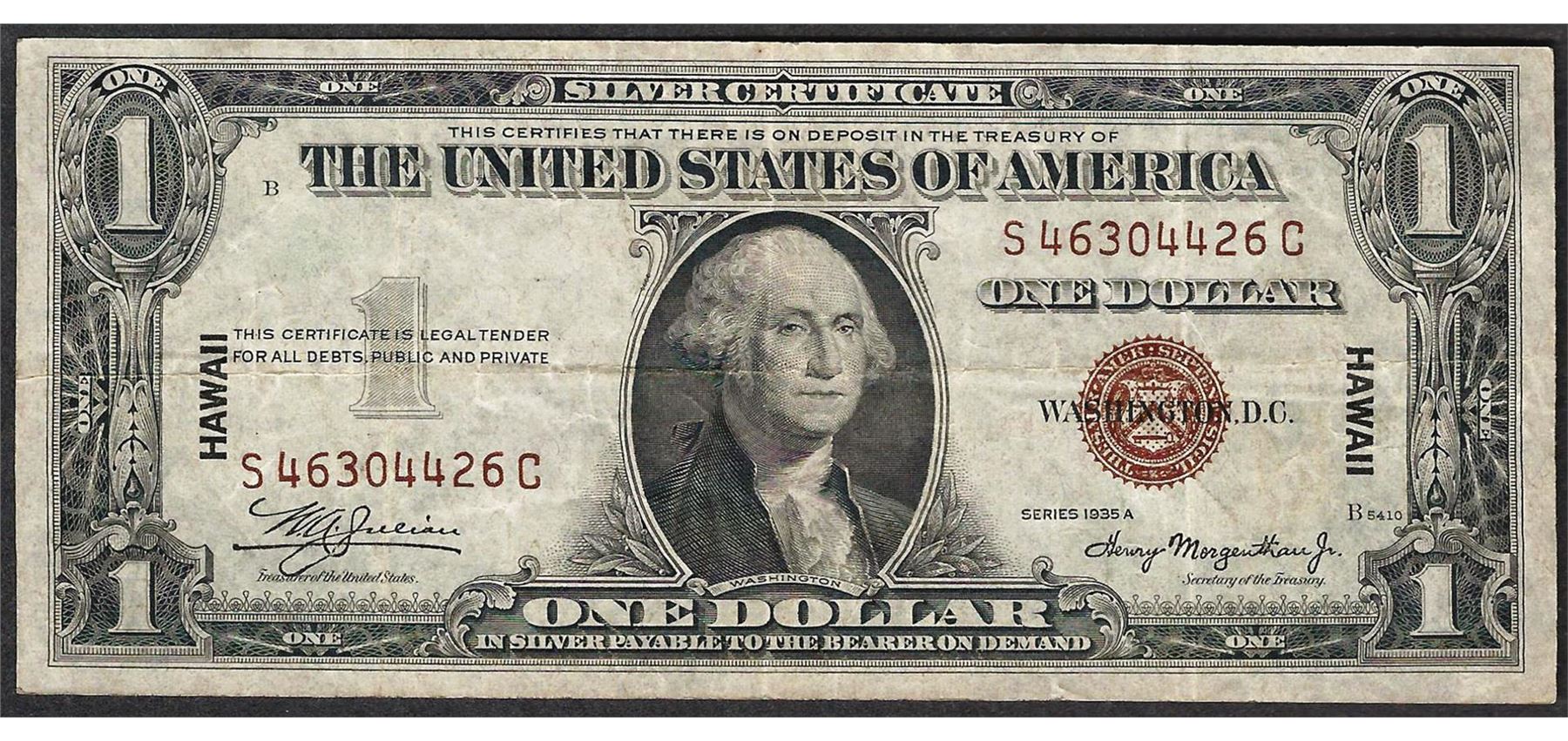 One 1935A $1 Silver Certificate WWII Emergency Hawaii Note.