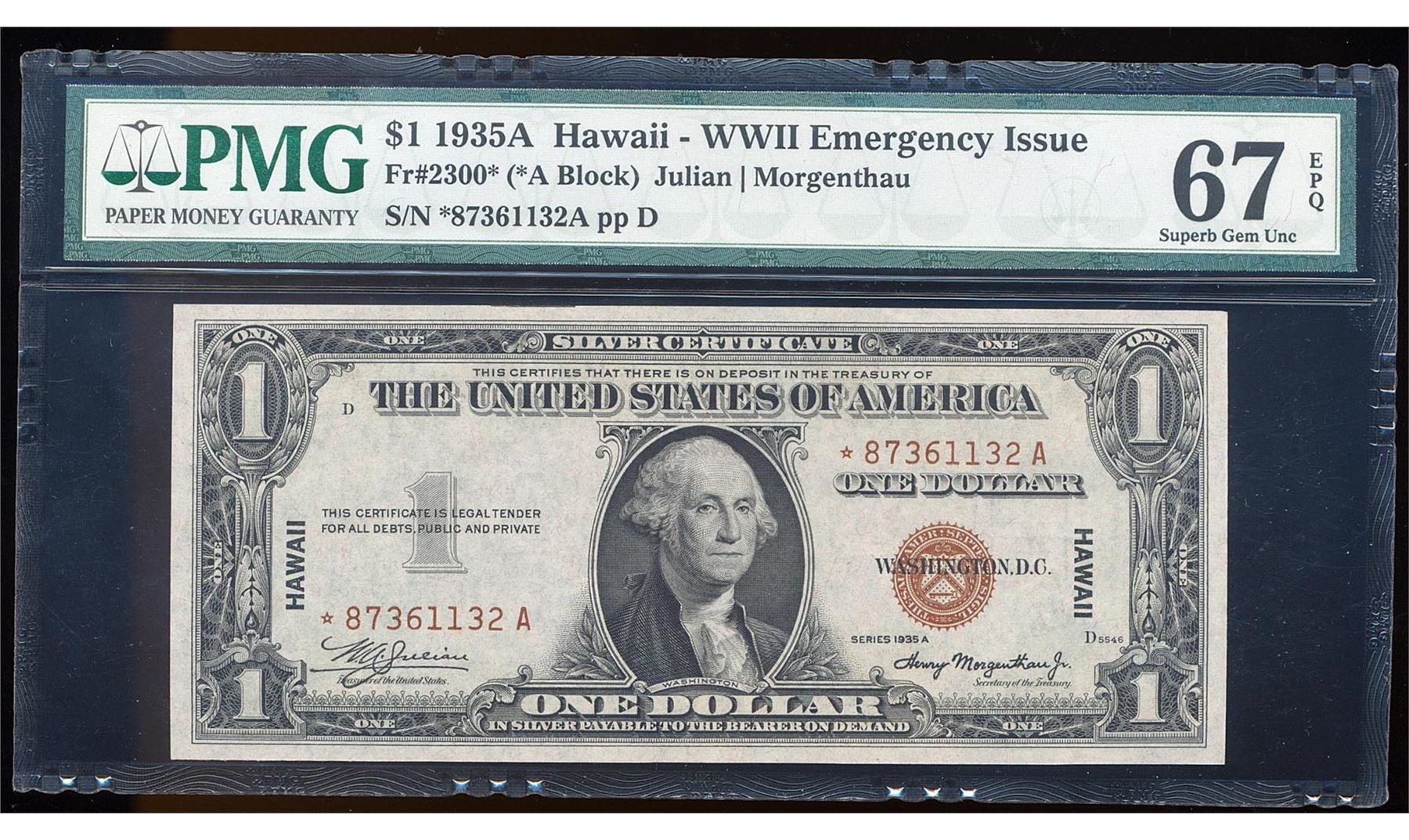 One 1935A $1 Silver Certificate WWII Emergency Hawaii STAR Note PMG Superb Gem Unc. 67EPQ. PMG Certified.