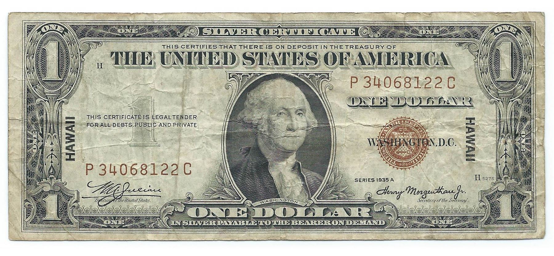 One 1935A $1 Silver Certificate WWII Hawaii Emergency Note