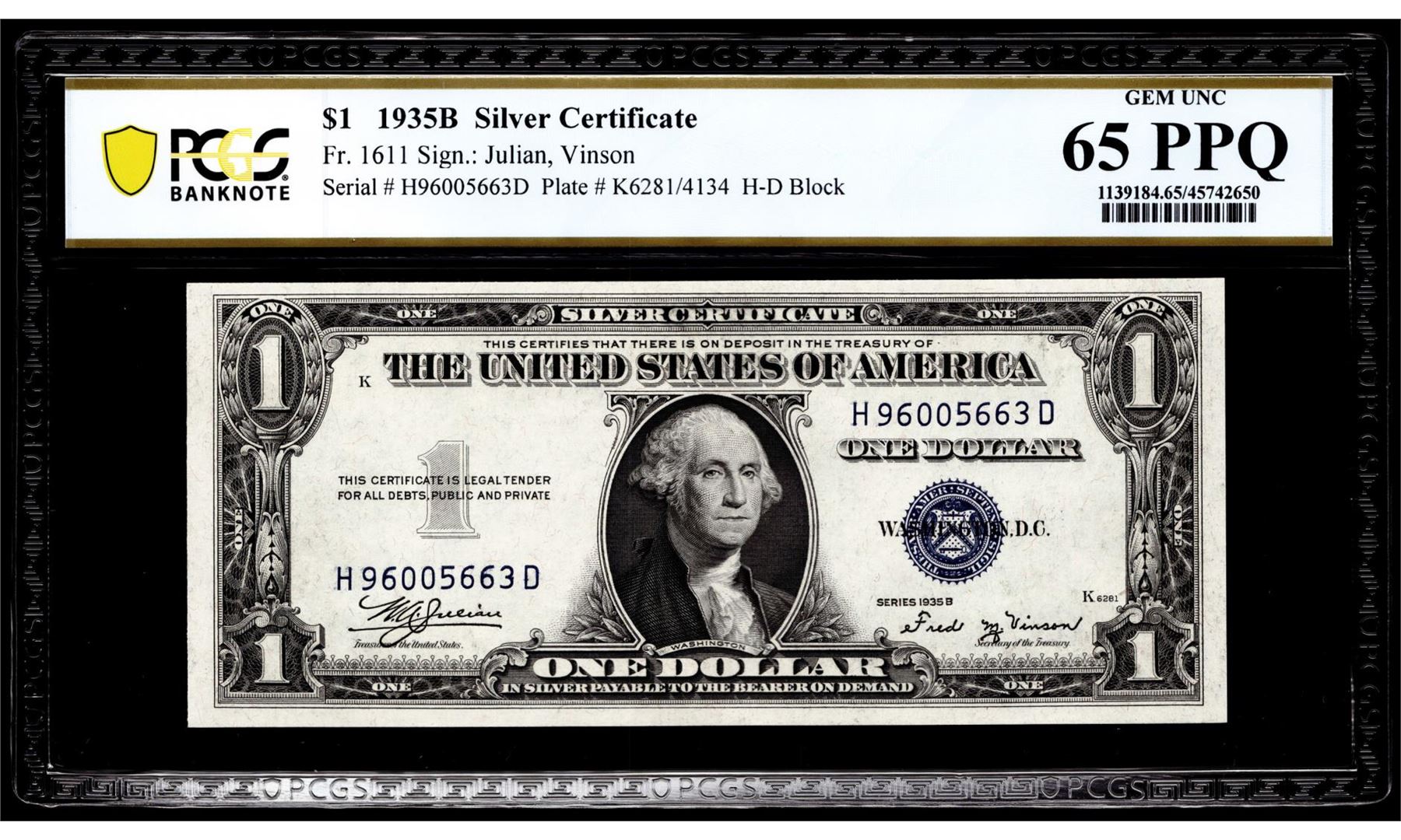 One 1935B $1 Silver Certificate Note Fr.1611 PCGS Gem Uncirculated 65PPQ. PCGS Graded.