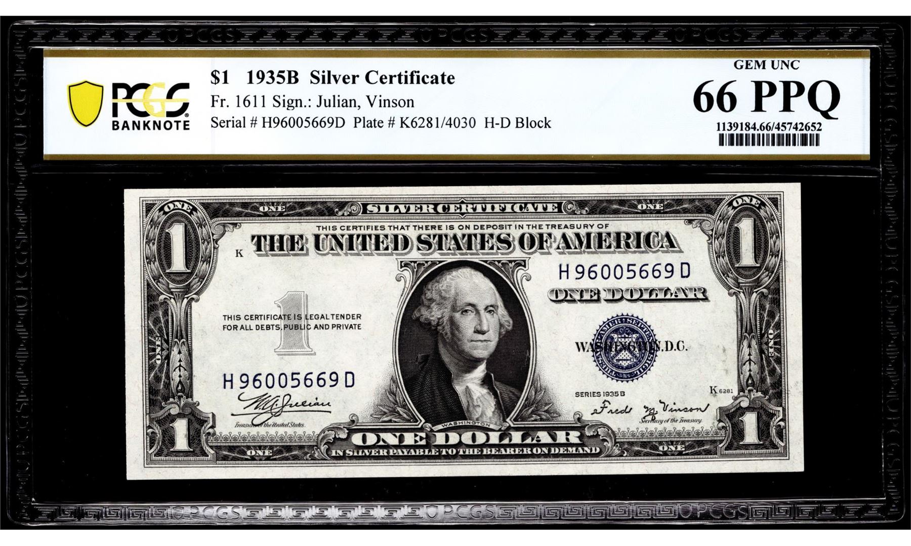 1935B $1 Silver Certificate Note Fr.1611 PCGS Gem Uncirculated 66PPQ