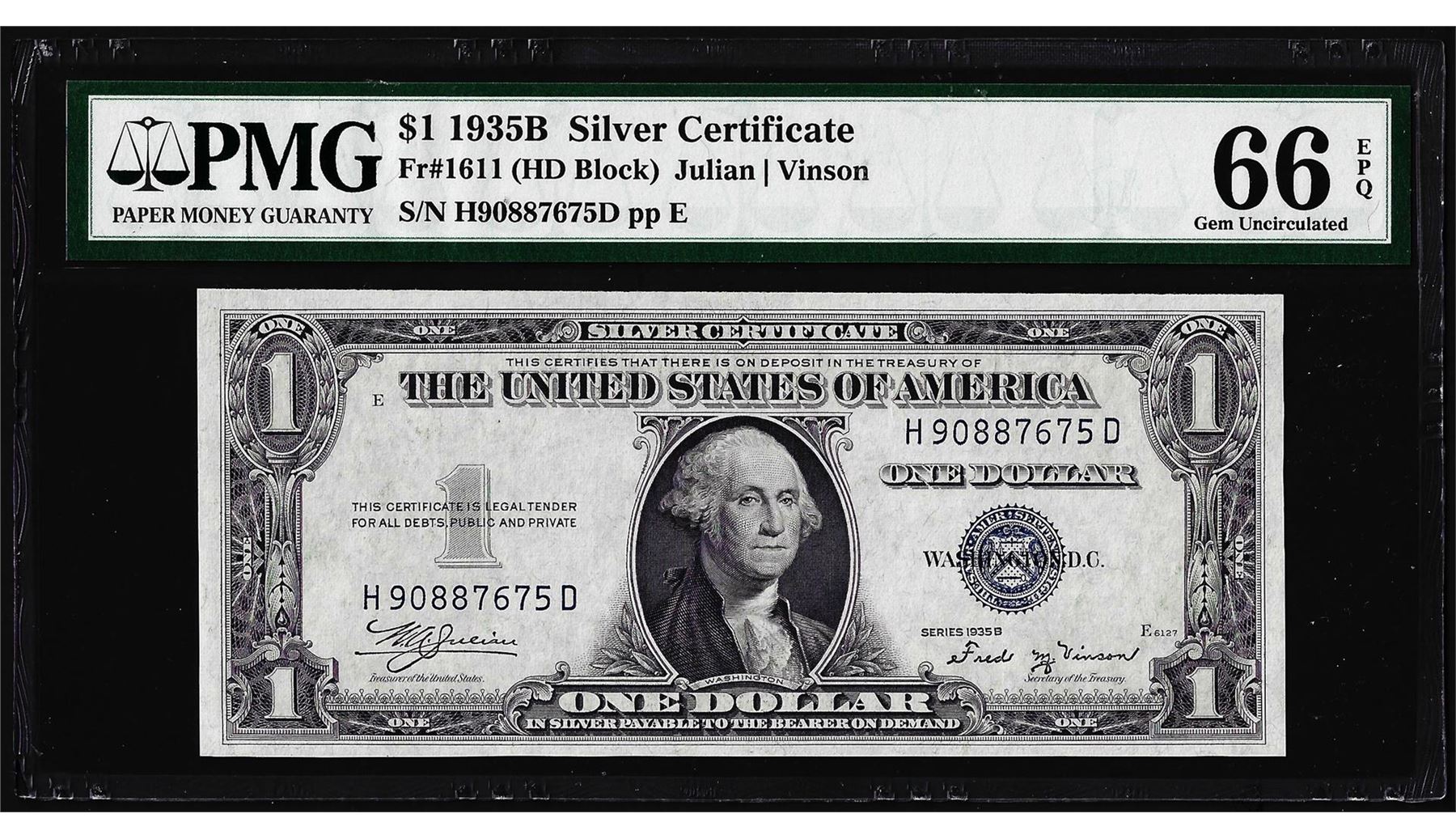 One 1935B $1 Silver Certificate Note Fr.1611 PMG Gem Uncirculated 66EPQ. PMG Certified.