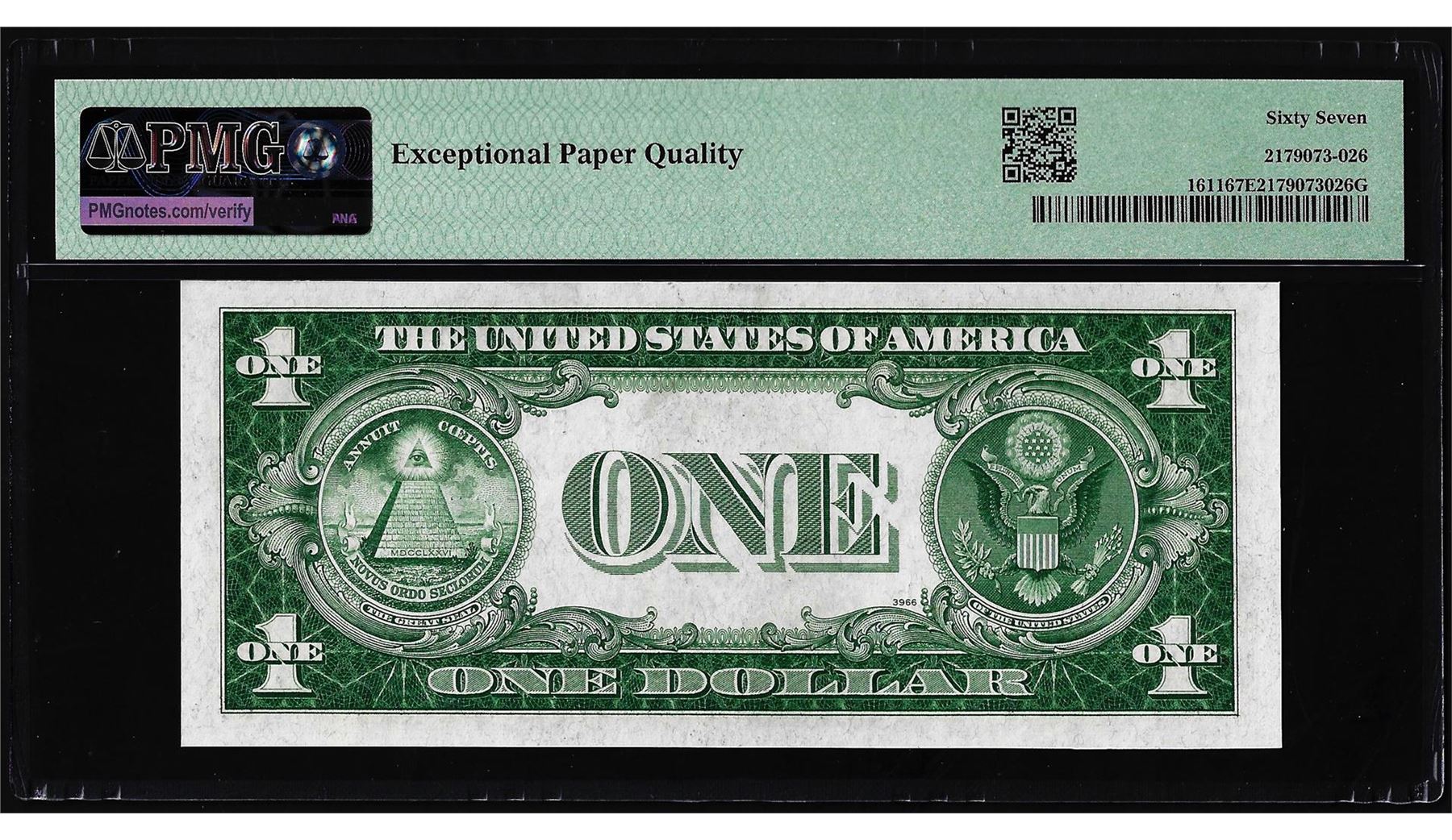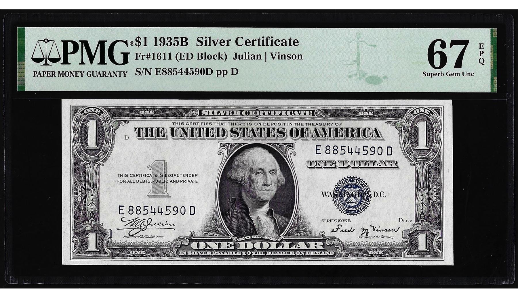 One 1935B $1 Silver Certificate Note Fr.1611 PMG Superb Gem Uncirculated 67EPQ. PMG Certified.