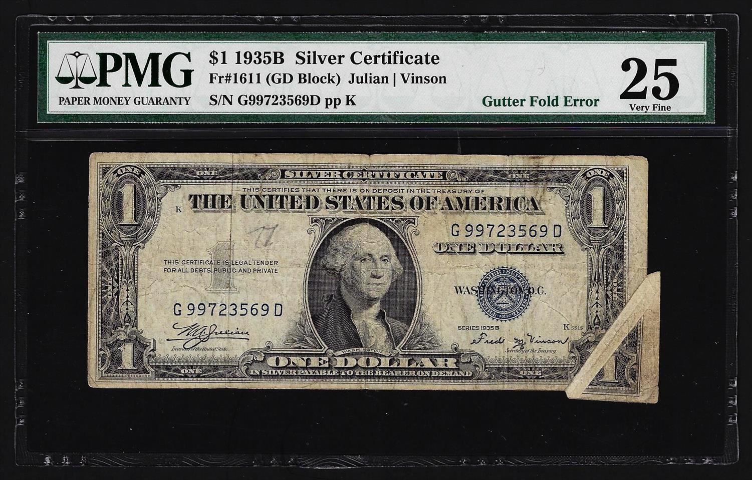 One 1935B $1 Silver Certificate Note Gutterfold ERROR PMG VF25. PMG Certified.