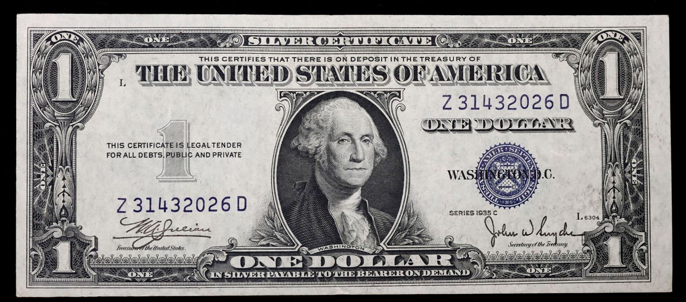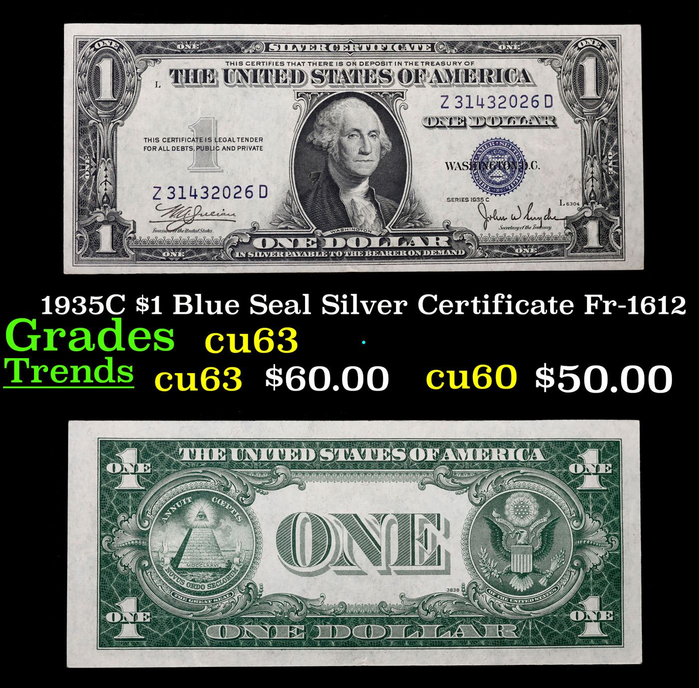 1935C $1 Blue Seal Silver Certificate Fr-1612 Grades Select CU. Silver Certificates were redeemable in Silver. One of their most distinctive qualities is the blue Treasury seal and serial numbers. These notes include an additional legend printed on the face that is not present on any other Federal Reserve notes. The legend states that Silver had been deposited in the Treasury and was payable on demand to the note’s bearer.
