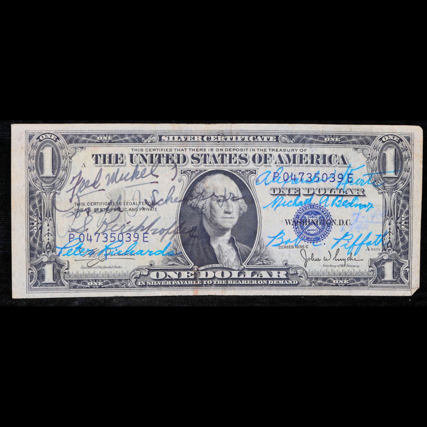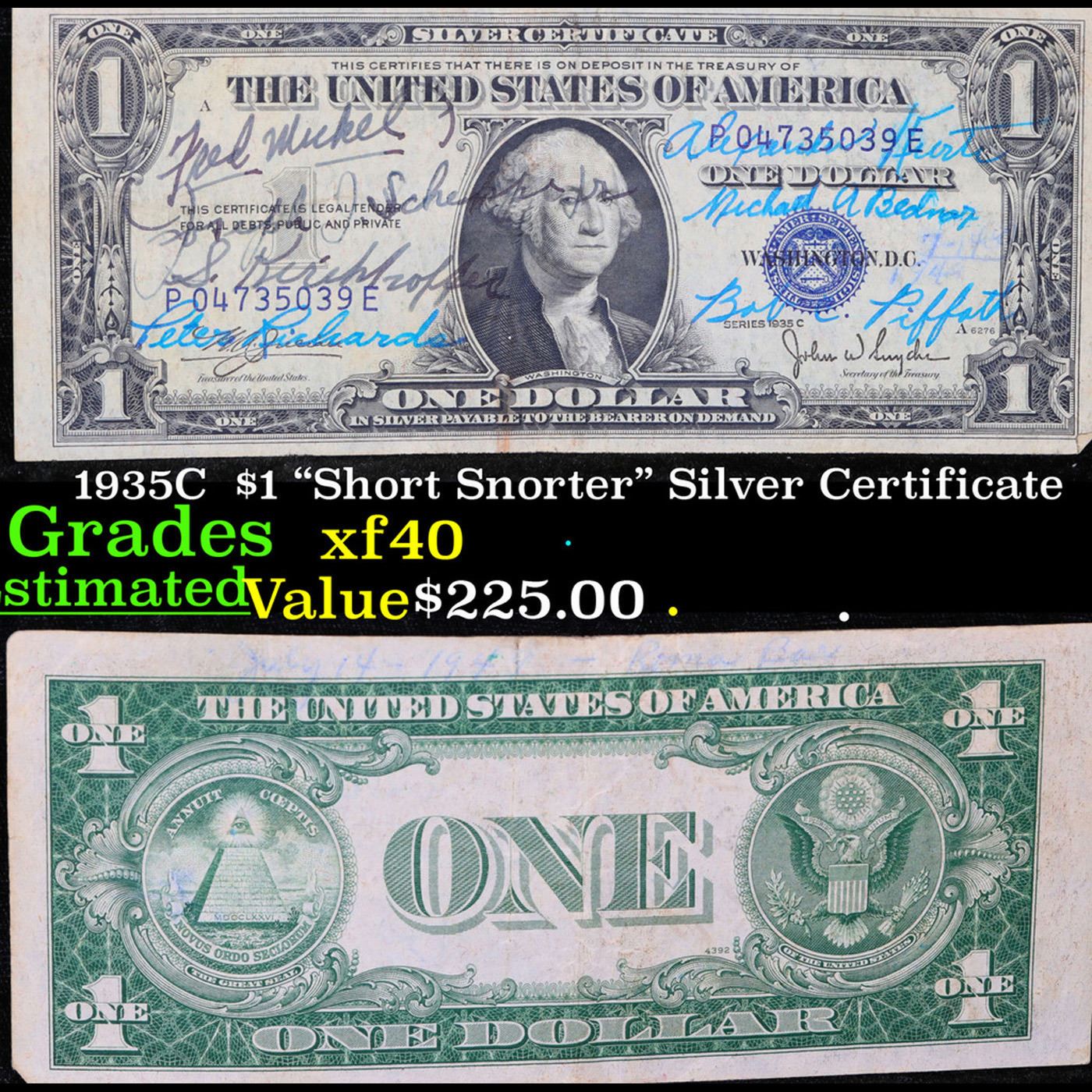 1935C $1 "Short Snorter" Silver Certificate Grades xf. A short snorter is a banknote inscribed by people traveling together on an aircraft. The tradition was started by Alaskan bush flyers in the 1920s and spread through the military and commercial aviation. During World War II short snorters were signed by flight crews and conveyed good luck to soldiers crossing the Atlantic Friends would take the local currency and sign each other's bills creating a "keepsake of your buddy's signatures". The General Hoyt Vandenberg short snorter was started in June 1942 flight over the mid-Atlantic. The Harry Hopkins short snorter was collected on July 25, 1942, by an aide of Franklin D. Roosevelt at a London Conference. The D. Ray Comish short snorter was collected January 1943 at the Casablanca Conference by Dixie Clipper. The Averell Harriman short snorter was collected by him at the January 1943 Casablanca Conference as well. The General George S. Patton snorter signatures were also collected at the Casablanca Conference. The Yalta short snorter signatures were collected on February 4–11, 1945 by Steve Early at Yalta, on the Crimean Peninsula.