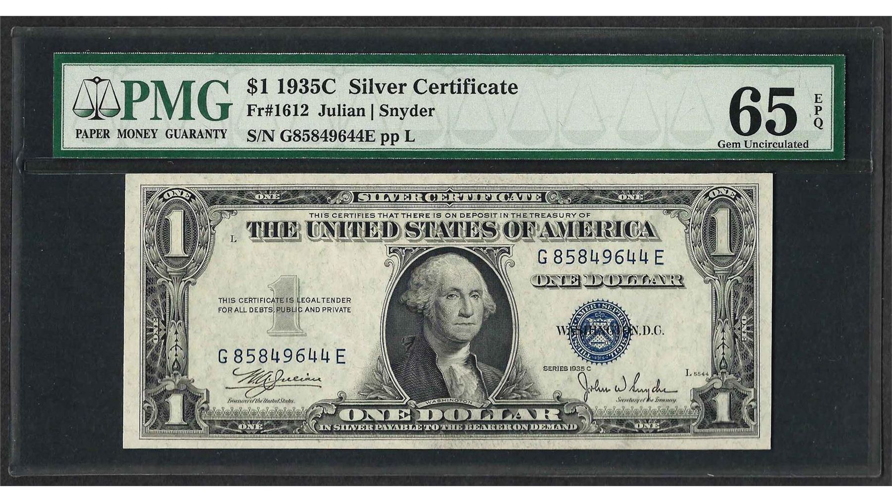One 1935C $1 Silver Certificate Note Fr.1612 PMG Gem Uncirculated 65EPQ. PMG Certified.