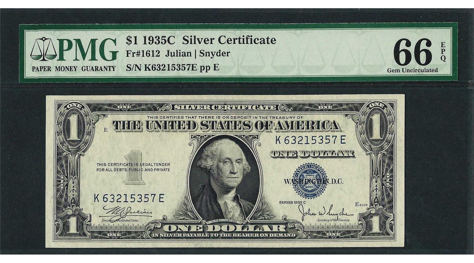 One 1935C $1 Silver Certificate Note Fr.1612 PMG Gem Uncirculated 66EPQ. PMG Certified.