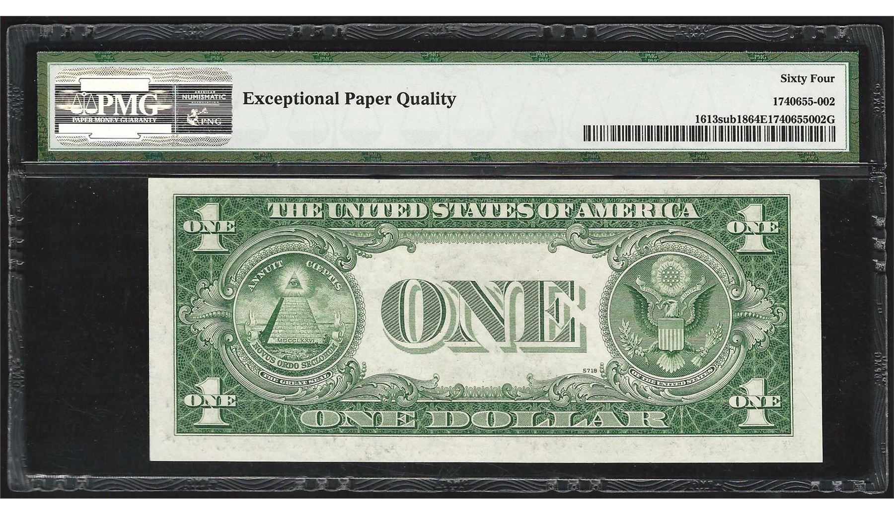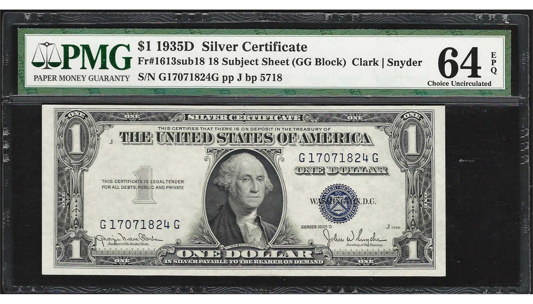 One 1935D $1 Silver Certificate Note Fr.1613 PMG Choice Uncirculated 64EPQ. PMG Certified.