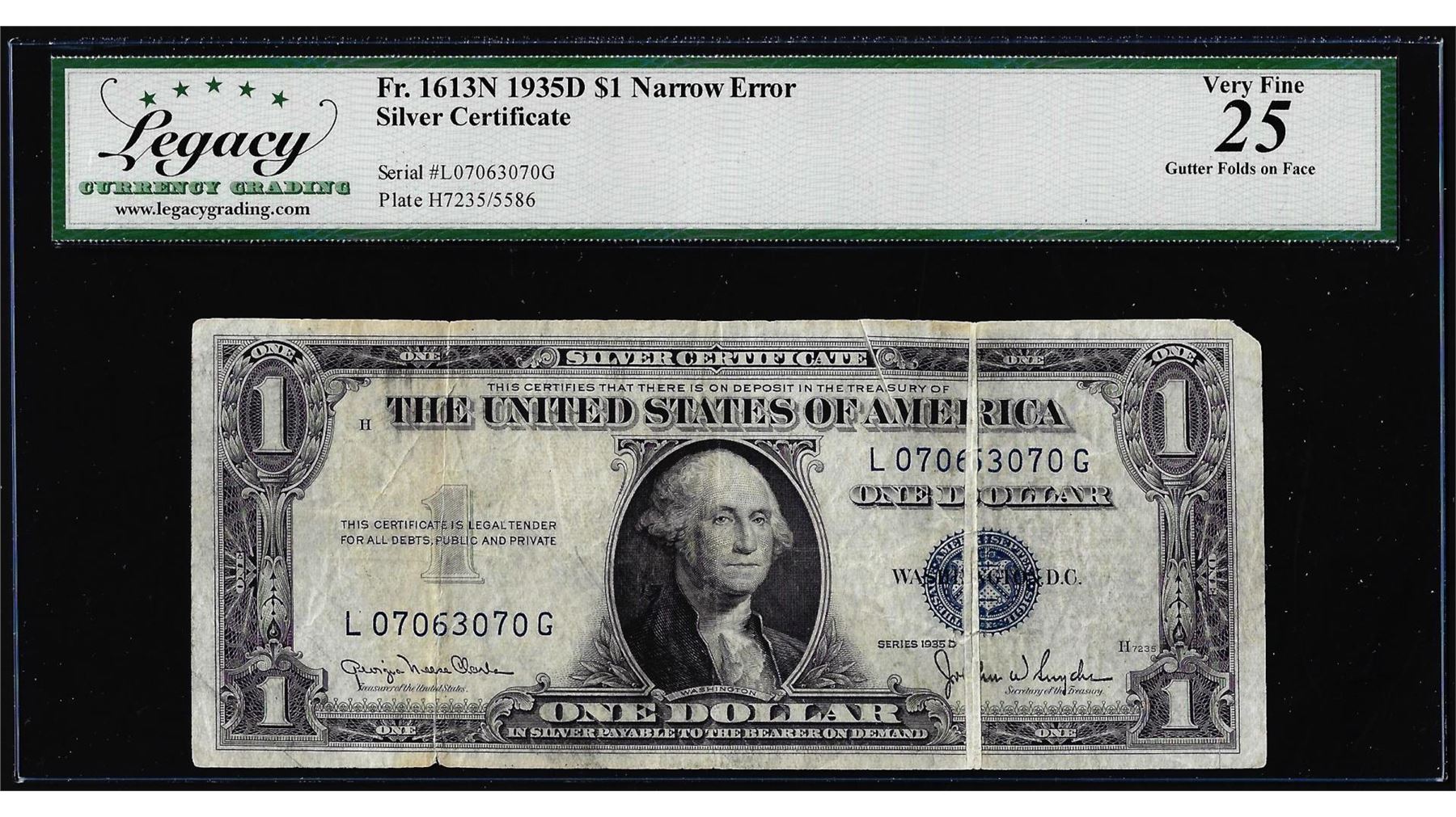 One 1935D $1 Silver Certificate Note Fr.1613N Gutter Fold Error Legacy Very Fine 25. Legacy Graded.