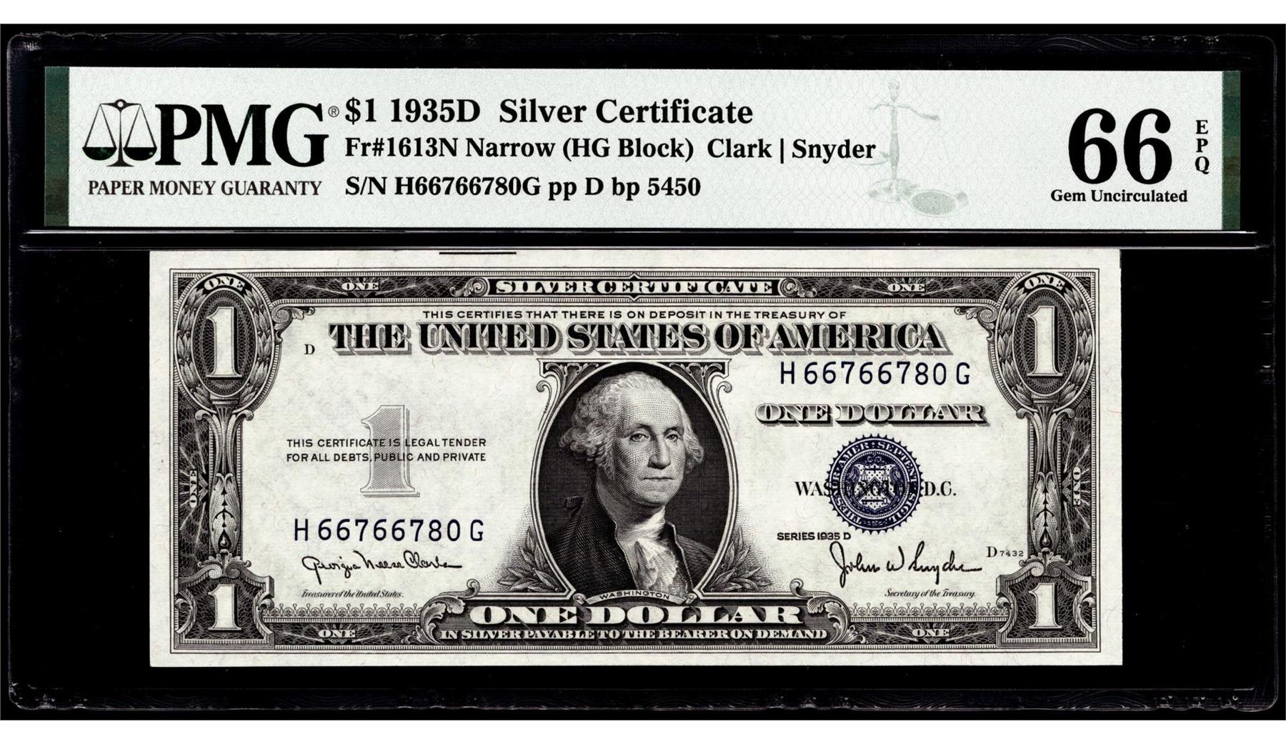 One 1935D $1 Silver Certificate Note Fr.1613N Narrow PMG Gem Uncirculated 66EPQ. PMG Certified.