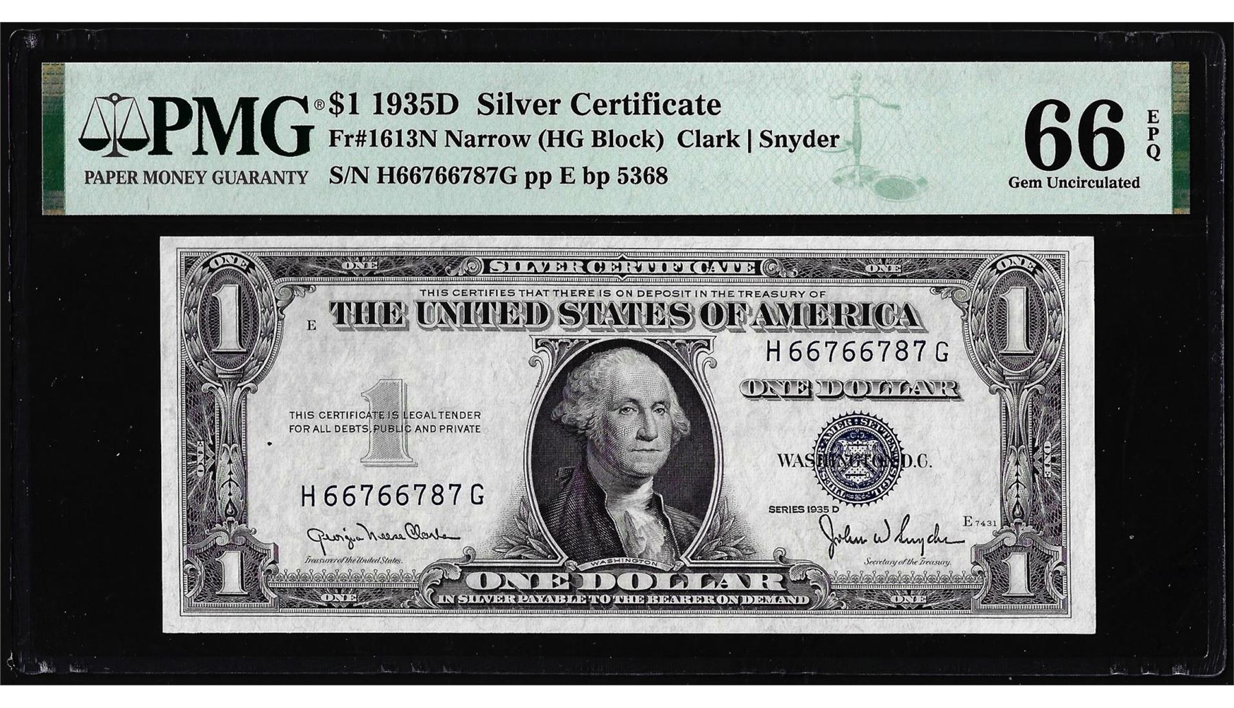 One 1935D $1 Silver Certificate Note Fr.1613N Narrow PMG Gem Uncirculated 66EPQ. PMG Certified.