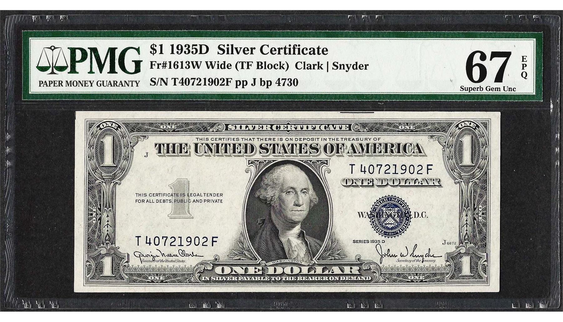 One 1935D $1 Silver Certificate Note Fr.1613W PMG Superb Gem Uncirculated 67EPQ. PMG Certified.