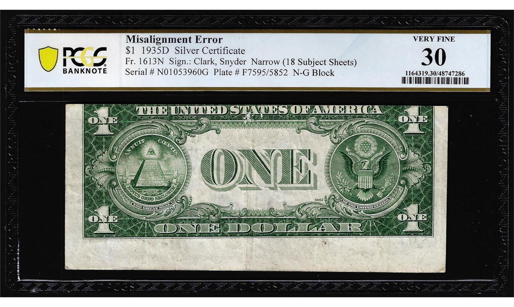 1935D $1 Silver Certificate Note Misalignment Error Fr.1613N PCGS Very Fine 30