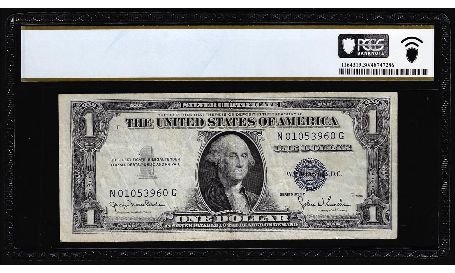 One 1935D $1 Silver Certificate Note Misalignment Error Fr.1613N PCGS Very Fine 30. PCGS Graded.