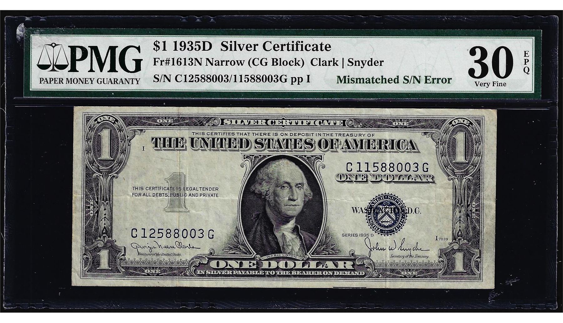 One 1935D $1 Silver Certificate Note Mismatched Serial Number Error Fr.1613N PMG VF 30EPQ. PMG Certified.