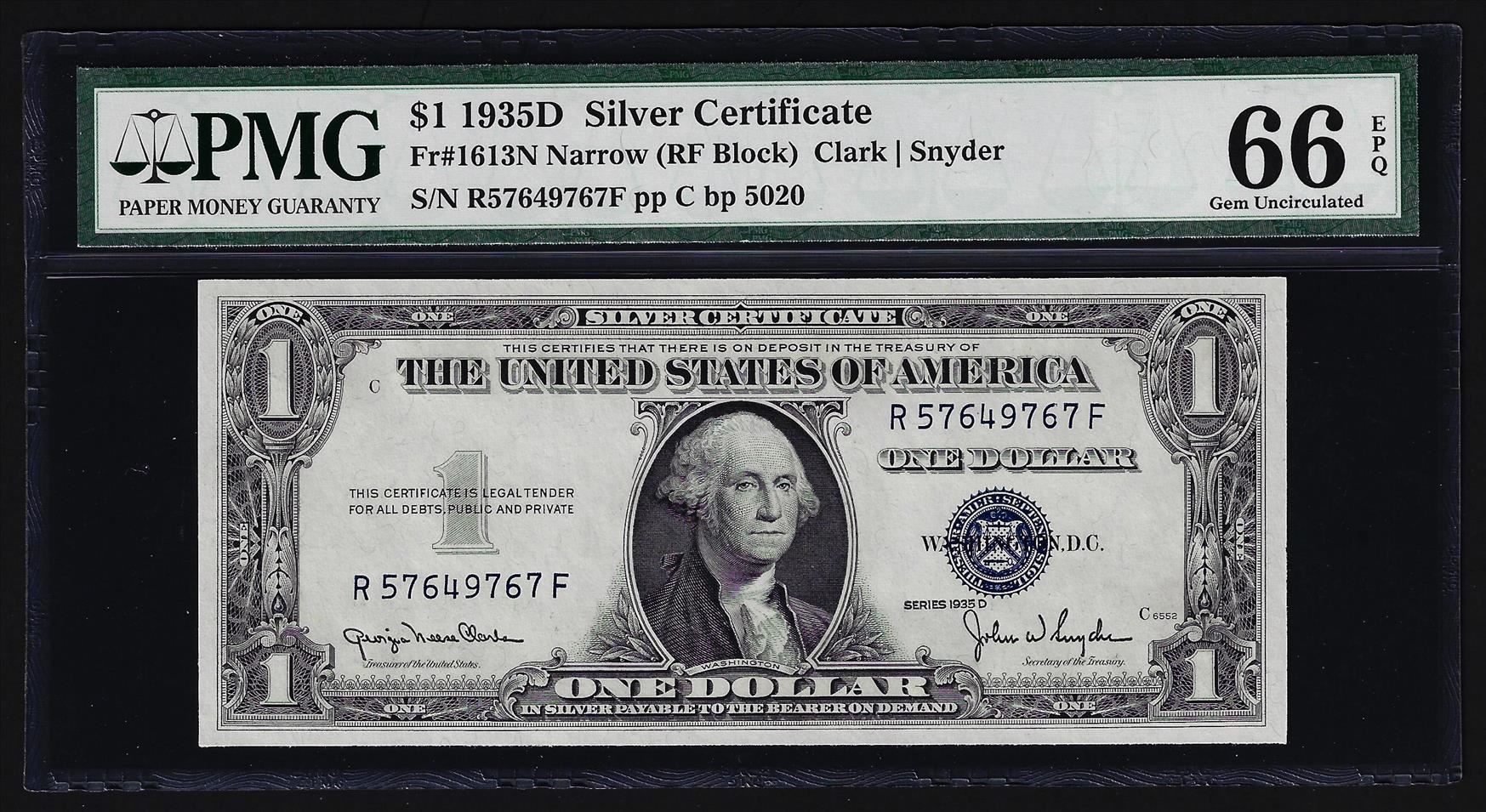 One 1935D $1 Silver Certificate Note Narrow PMG Gem Uncirculated 66EPQ. PMG Certified.