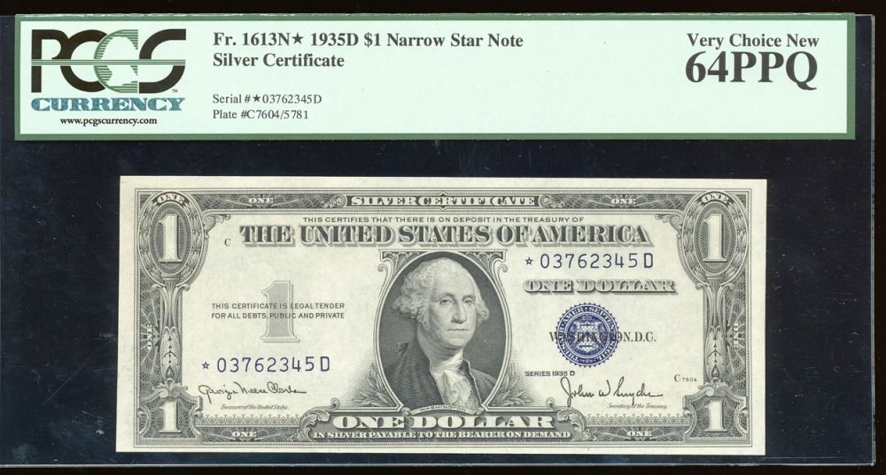 One 1935D $1 Silver Certificate Star Note PCGS 64PPQ.