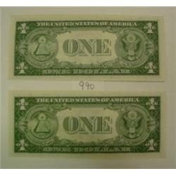 Vintage paper U.S. dollars. $1.00 Silver Certificates. Uncirculated. No motto. Consecutive numbers. 1935D I26571163G and I26571164G.