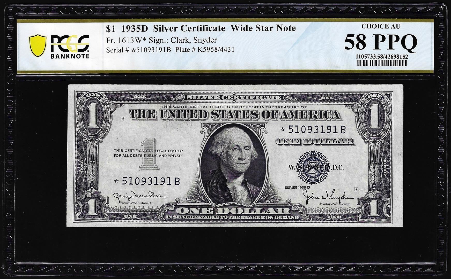 One 1935D Wide $1 Silver Certificate Star Note Fr.1613W* PCGS Choice About Unc. 58PPQ. PCGS Graded.