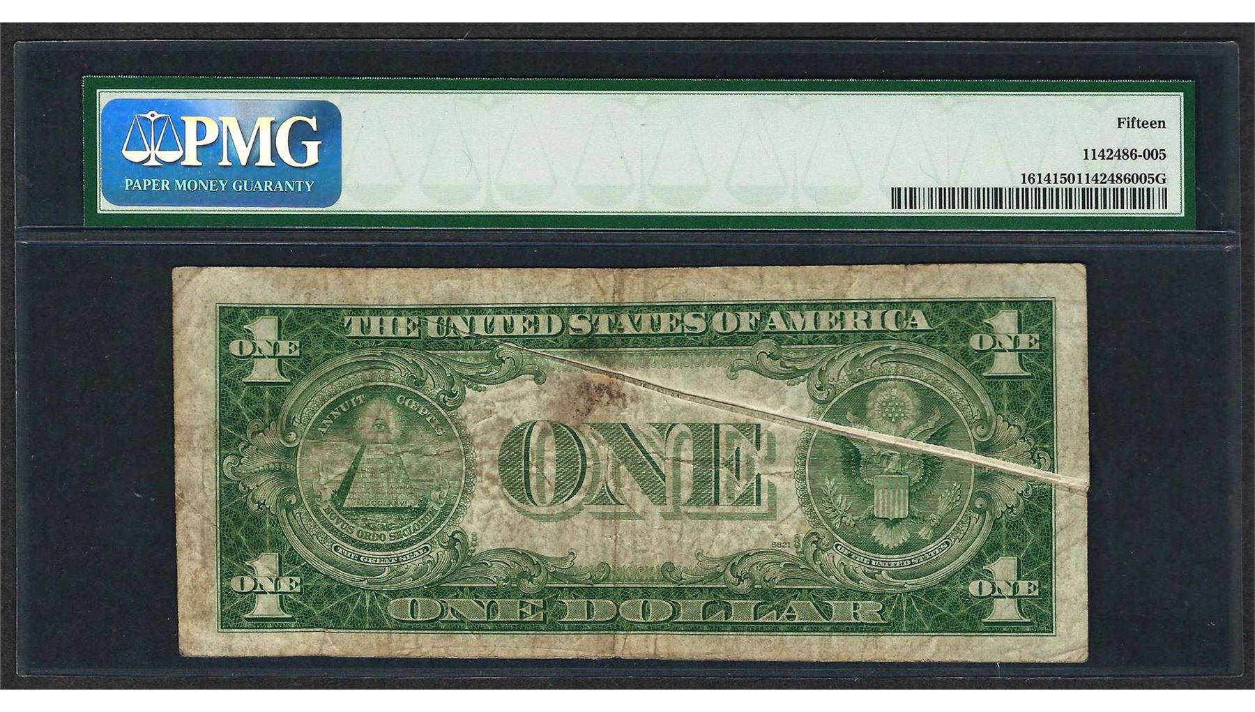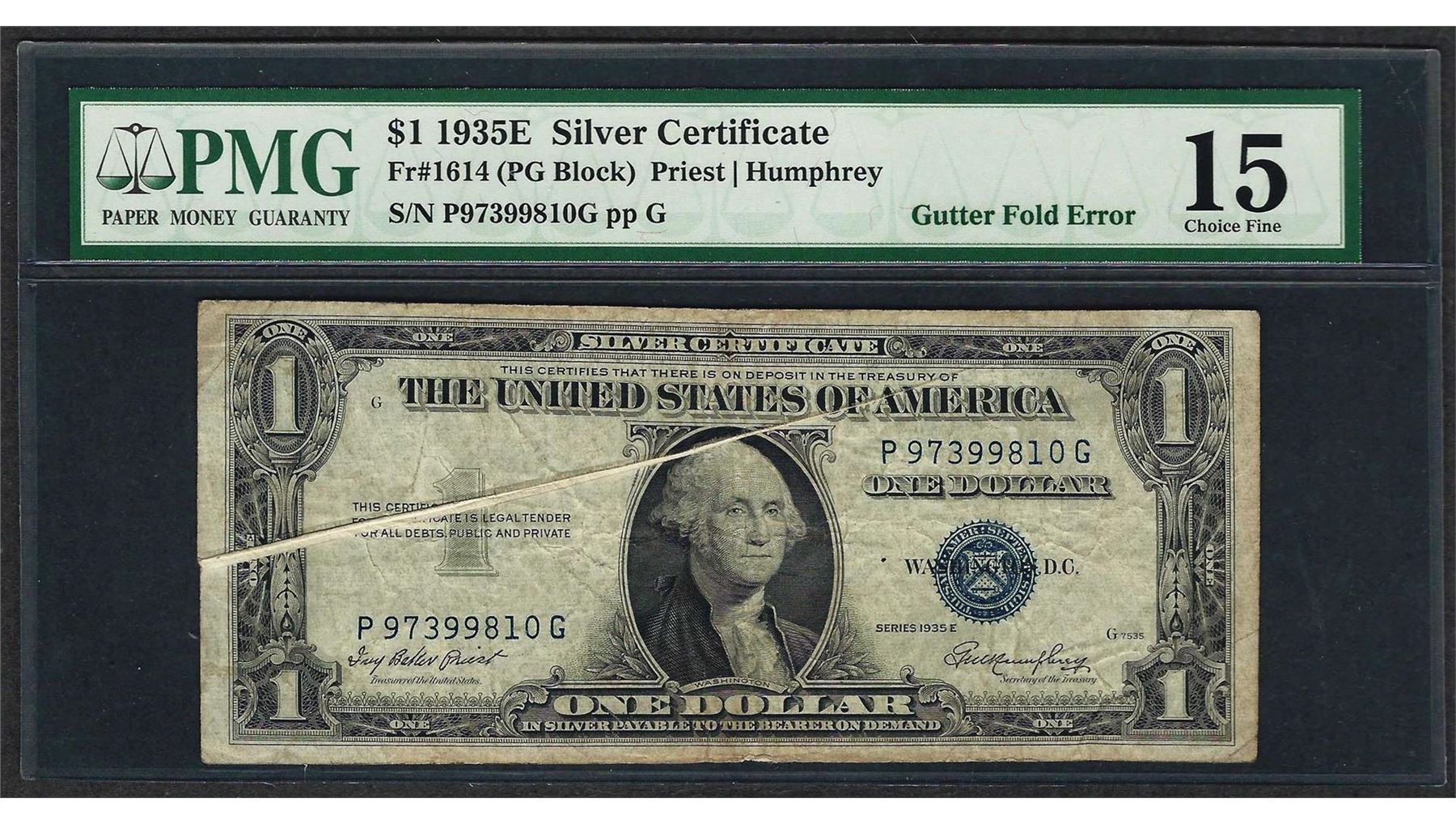 One 1935E $1 Silver Certificate Note ERROR Gutter Fold Fr.1614 PMG Choice Fine 15. PMG Certified.