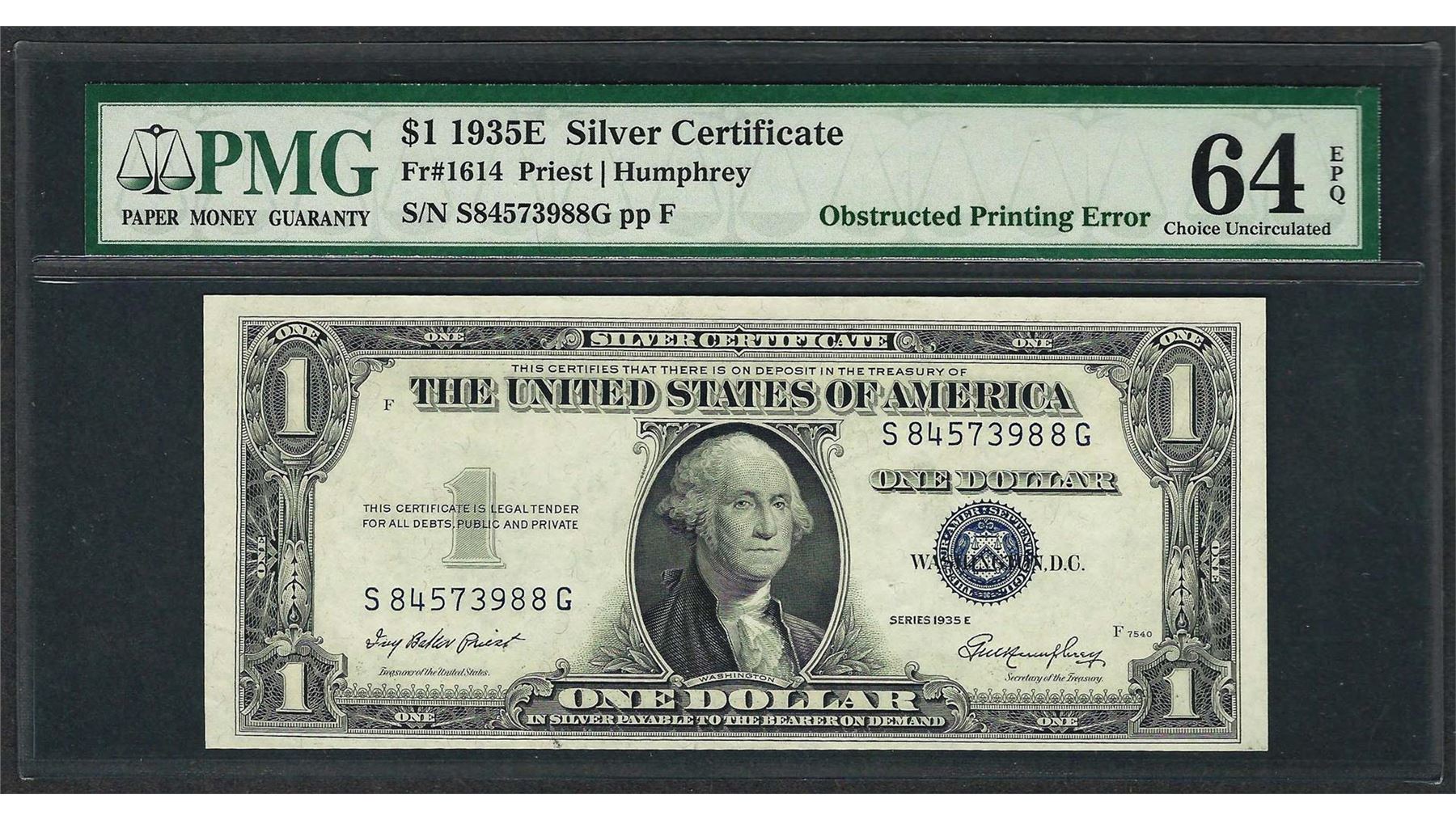 One 1935E $1 Silver Certificate Note ERROR Obstructed Printing PMG Ch Uncirculated 64EPQ. PMG Certified.