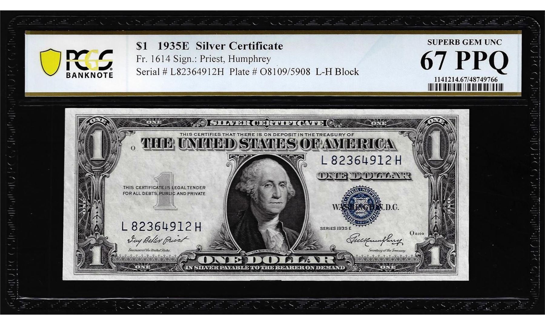 One 1935E $1 Silver Certificate Note Fr.1614 PCGS Superb Gem Uncirculated 67PPQ. PCGS Graded.