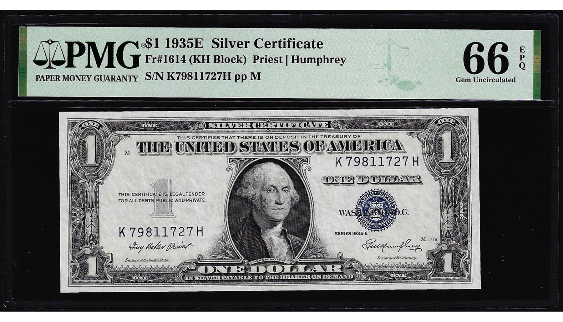 One 1935E $1 Silver Certificate Note Fr.1614 PMG Gem Uncirculated 66EPQ. PMG Certified.