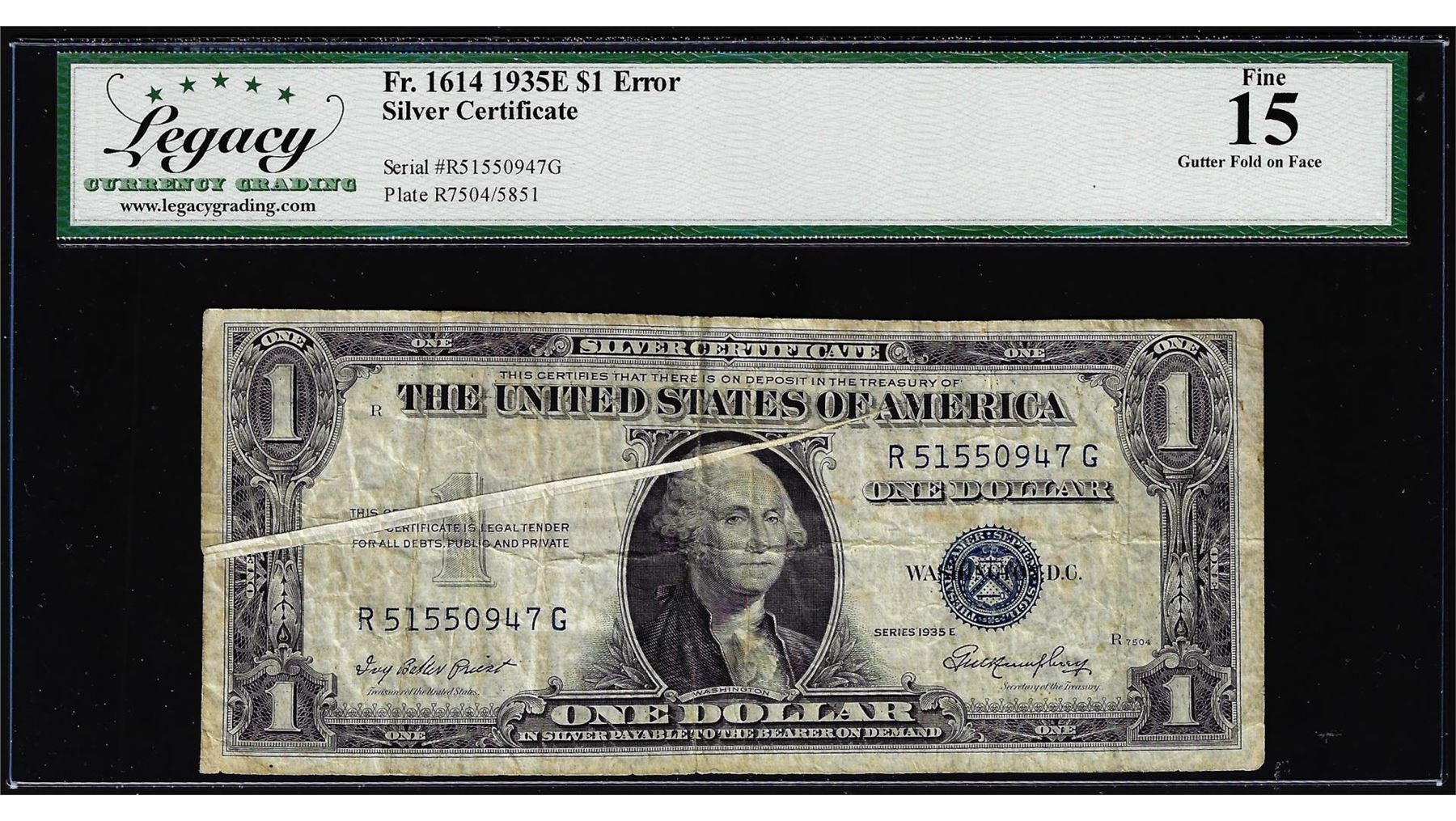 One 1935E $1 Silver Certificate Note Gutter Fold Error Fr.1614 Legacy Fine 15. Legacy Graded.