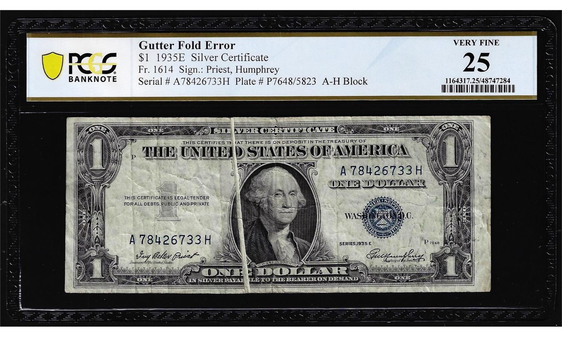 One 1935E $1 Silver Certificate Note Gutter Fold Error Fr.1614 PCGS Very Fine 25. PCGS Graded.