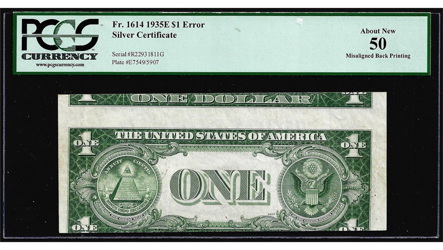 One 1935E $1 Silver Certificate Note Misaligned Back Print ERROR Fr.1614 PCGS About New 50. PCGS Graded.