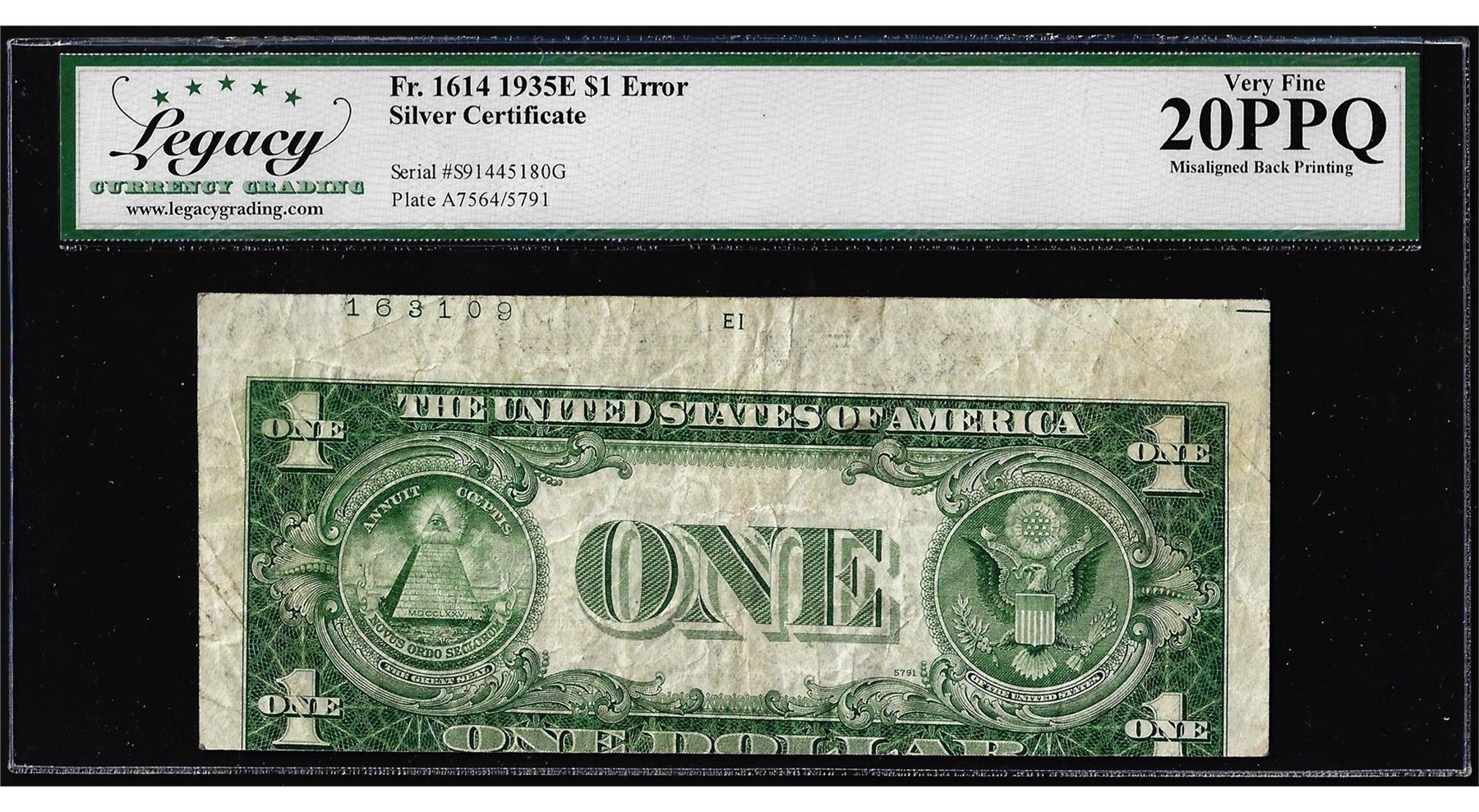 One 1935E $1 Silver Certificate Note Misaligned Back Printing Error Legacy Very Fine 20PPQ. Legacy Graded.