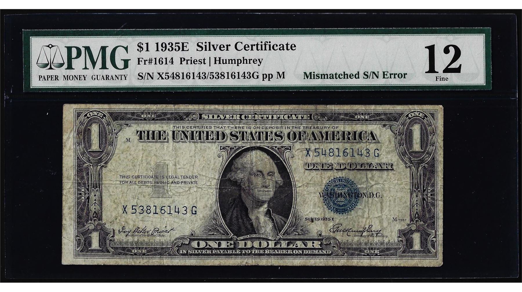 One 1935E $1 Silver Certificate Note Mismatched Serial Number Error Fr.1614 PMG Fine 12. PMG Certified.