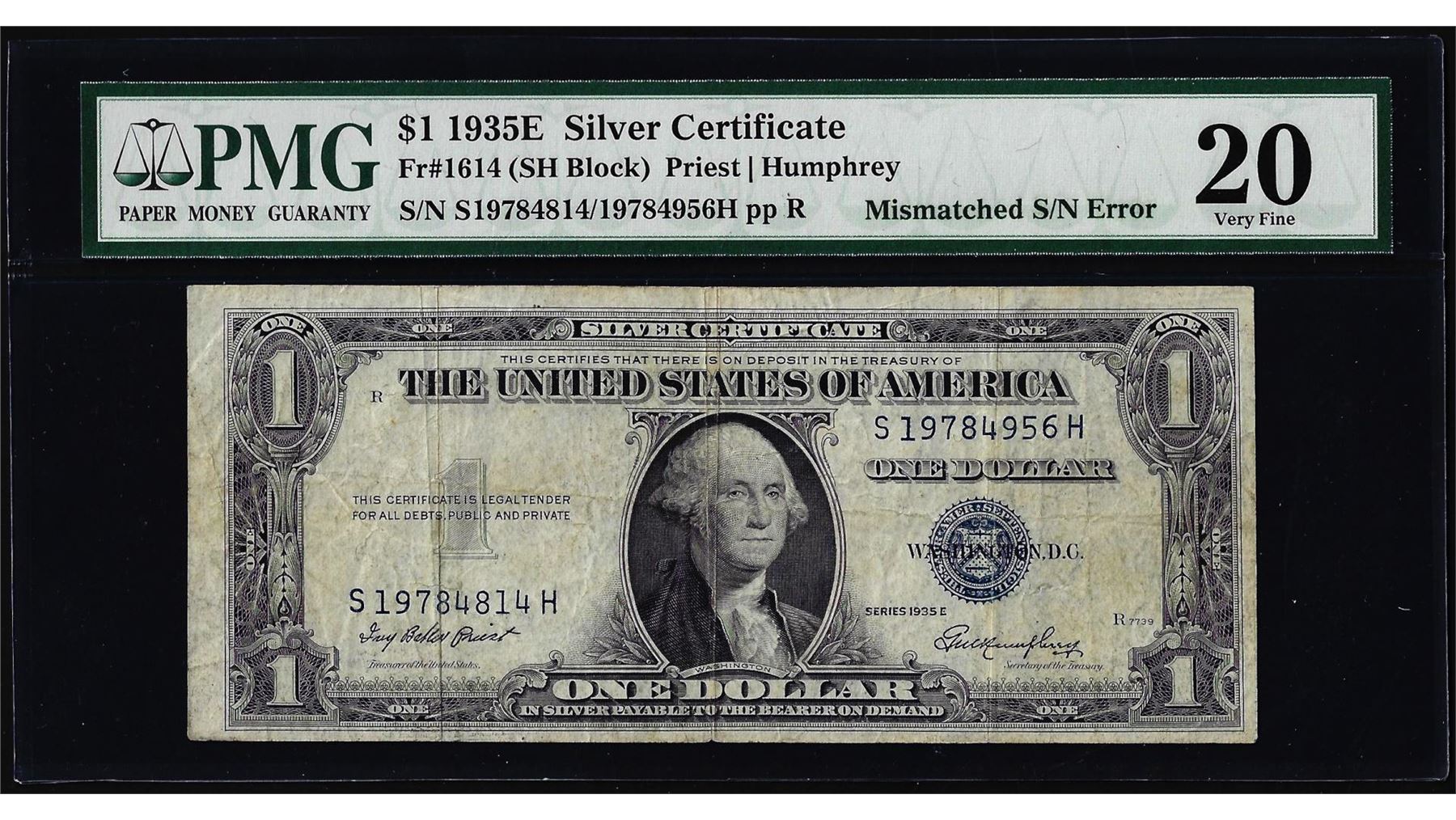 One 1935E $1 Silver Certificate Note Mismatched Serial Number Error PMG Very Fine 20. PMG Certified.