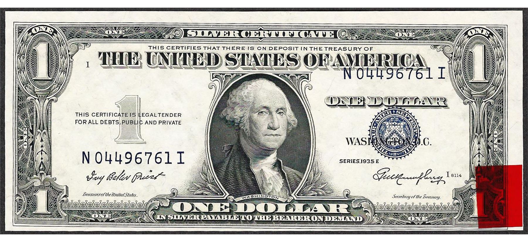 One 1935E $1 Silver Certificate Note Shift ERROR with BEP Rejection Sticker.
