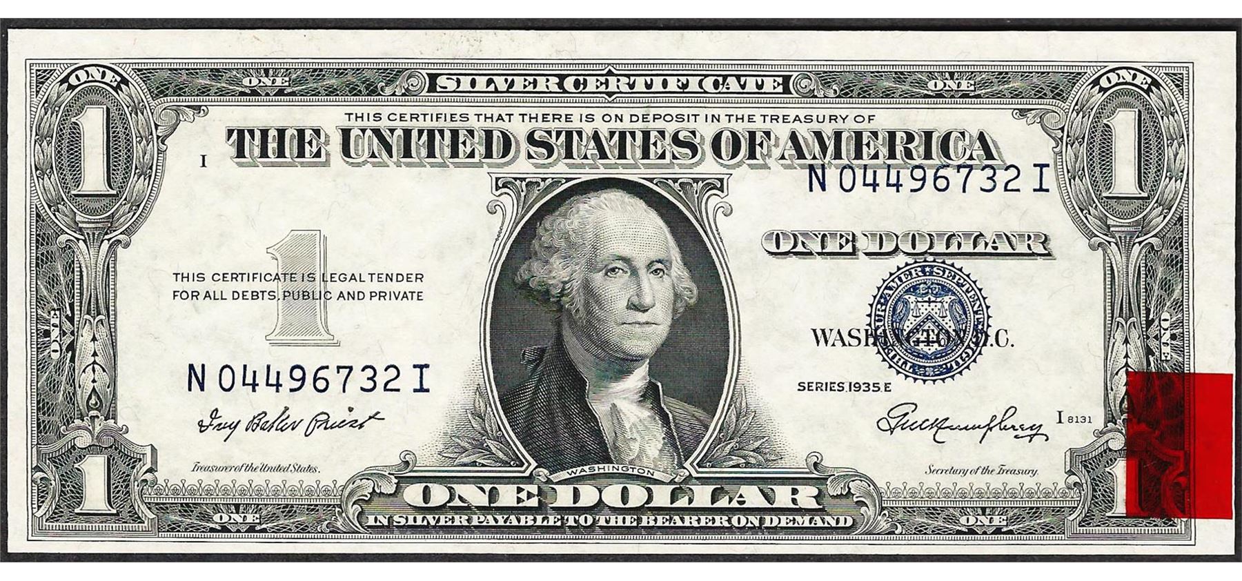 One 1935E $1 Silver Certificate Note Shift ERROR with BEP Rejection Sticker.