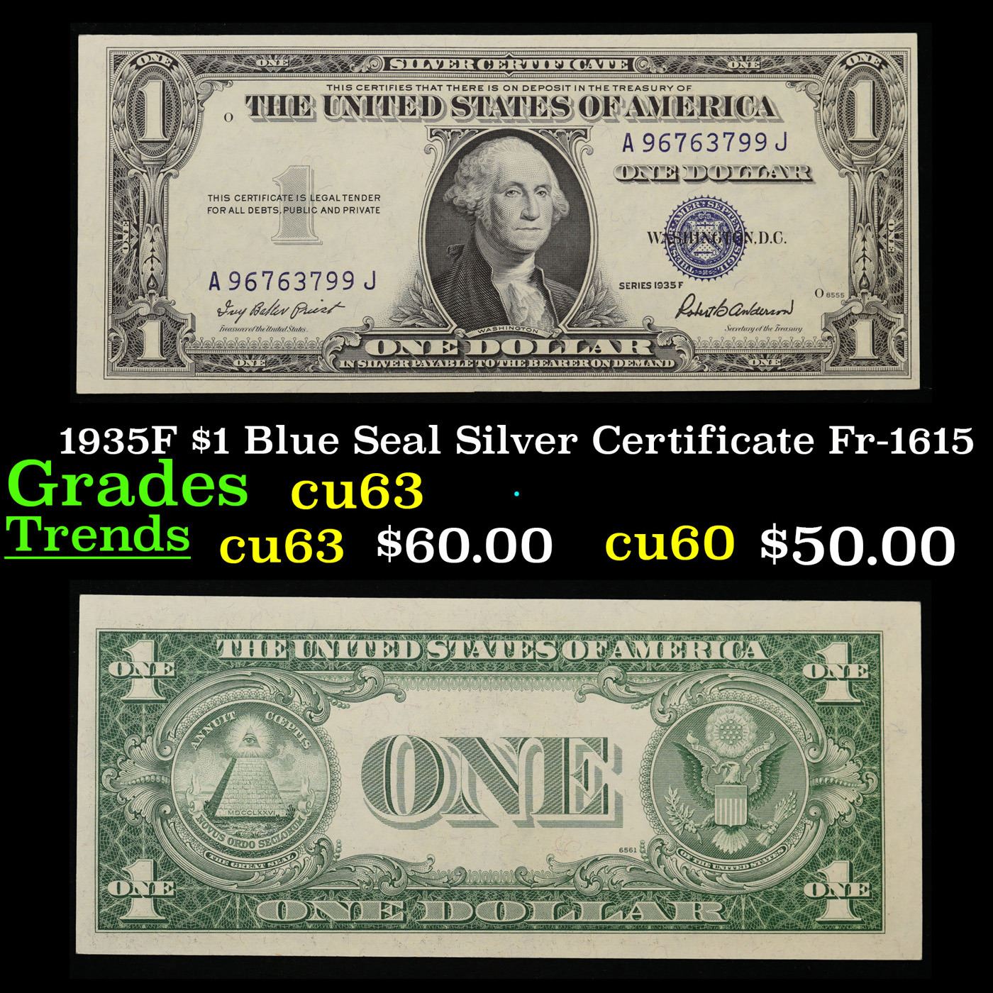 1935F $1 Blue Seal Silver Certificate Fr-1615 Grades Select CU. Silver Certificates were redeemable in Silver. One of their most distinctive qualities is the blue Treasury seal and serial numbers. These notes include an additional legend printed on the face that is not present on any other Federal Reserve notes. The legend states that Silver had been deposited in the Treasury and was payable on demand to the note’s bearer. There are many Verities of this note and it is a complex issue. There are brown seal Hawaii notes, yellow seal North Africa notes, red R and red S experimentals. Plus you have all of the standard 1935, 1935A, 1935B, 1935C, 1935D, 1935E, 1935F, 1935G, and 1935H issues.