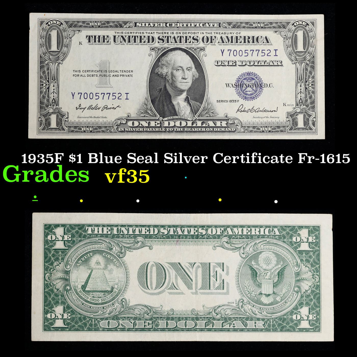 1935F $1 Blue Seal Silver Certificate Fr-1615 Grades vf++. Silver Certificates were redeemable in Silver. One of their most distinctive qualities is the blue Treasury seal and serial numbers. These notes include an additional legend printed on the face that is not present on any other Federal Reserve notes. The legend states that Silver had been deposited in the Treasury and was payable on demand to the note’s bearer.