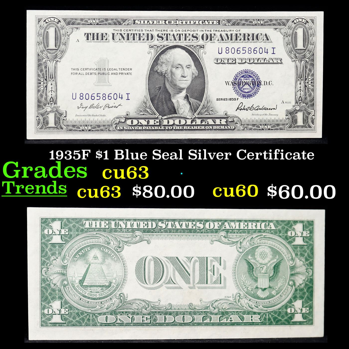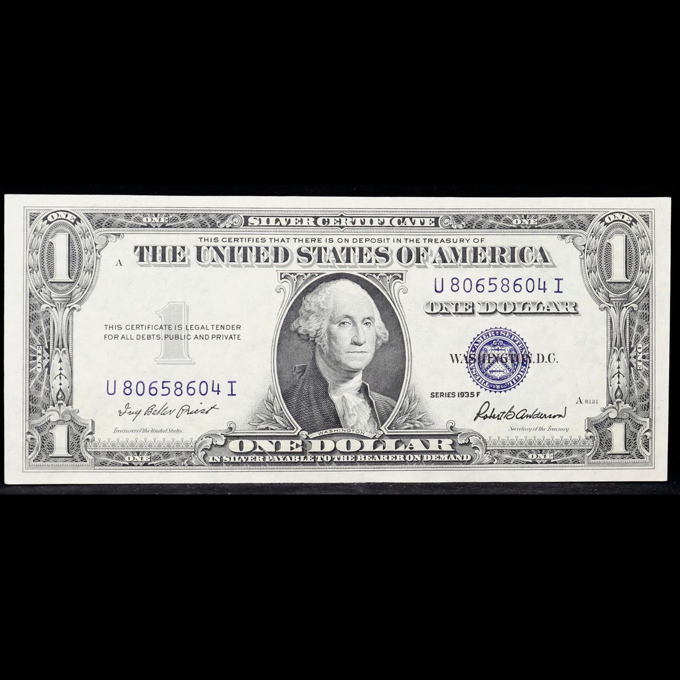 1935F $1 Blue Seal Silver Certificate Grades Select CU. Silver Certificates were redeemable in Silver. One of their most distinctive qualities is the blue Treasury seal and serial numbers. These notes include an additional legend printed on the face that is not present on any other Federal Reserve notes. The legend states that Silver had been deposited in the Treasury and was payable on demand to the note’s bearer.