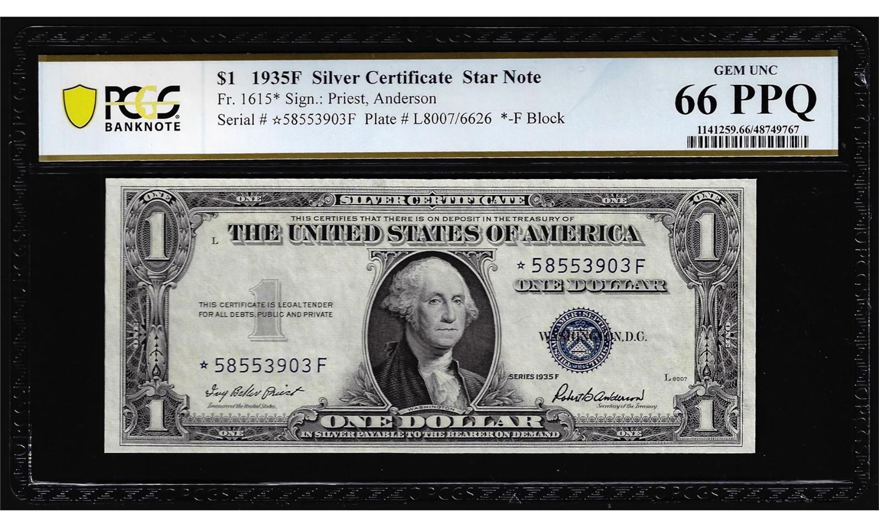 One 1935F $1 Silver Certificate STAR Note Fr.1615* PCGS Gem Uncirculated 66PPQ. PCGS Graded.