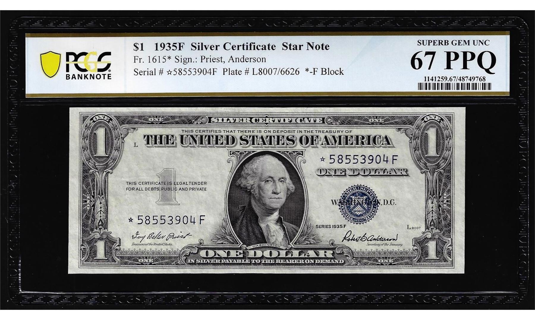 One 1935F $1 Silver Certificate STAR Note Fr.1615* PCGS Superb Gem Uncirculated 67PPQ. PCGS Graded.
