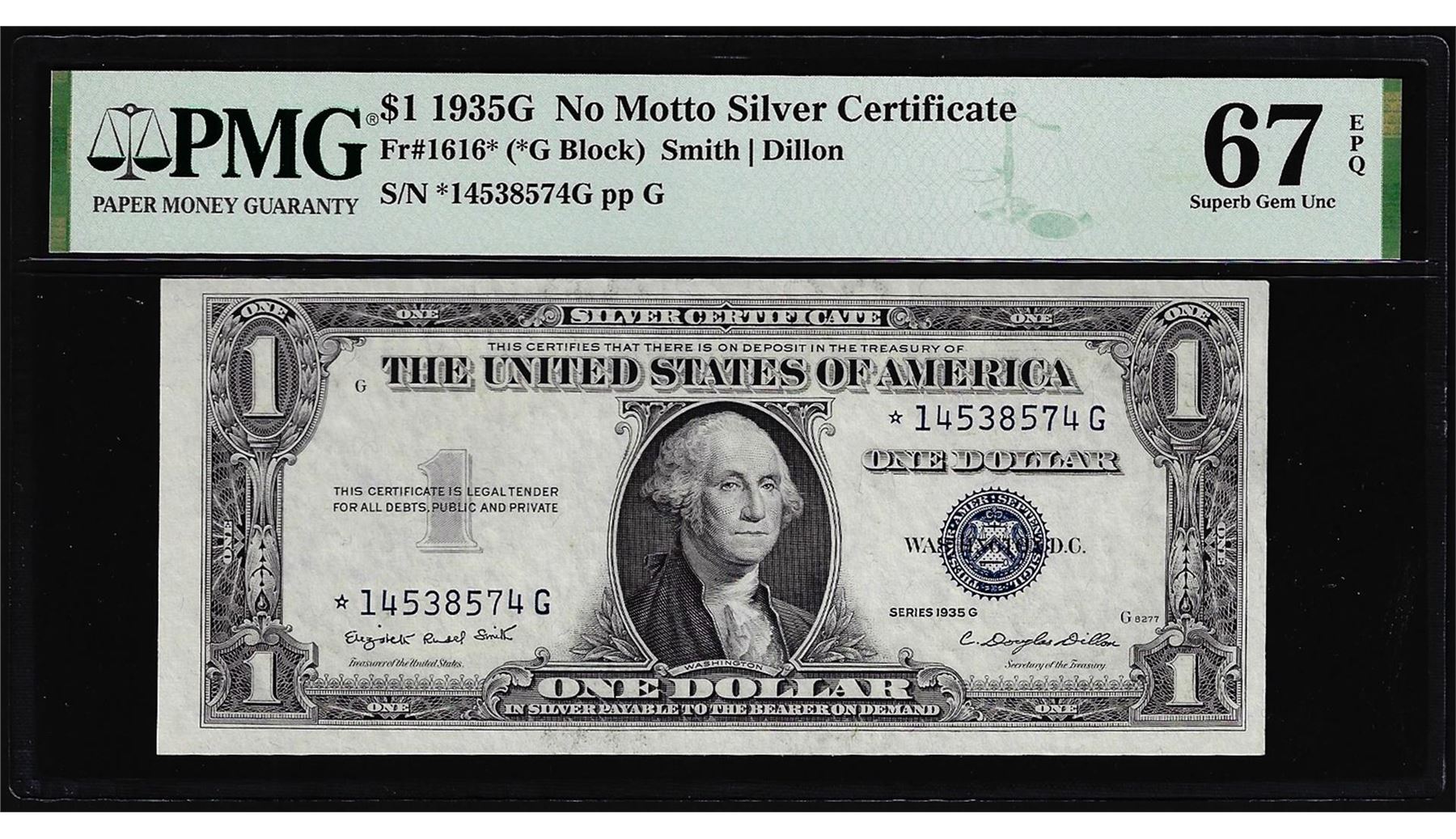 One 1935G $1 Silver Certificate STAR Note Fr.1616* PMG Superb Gem Uncirculated 67EPQ. PMG Certified.