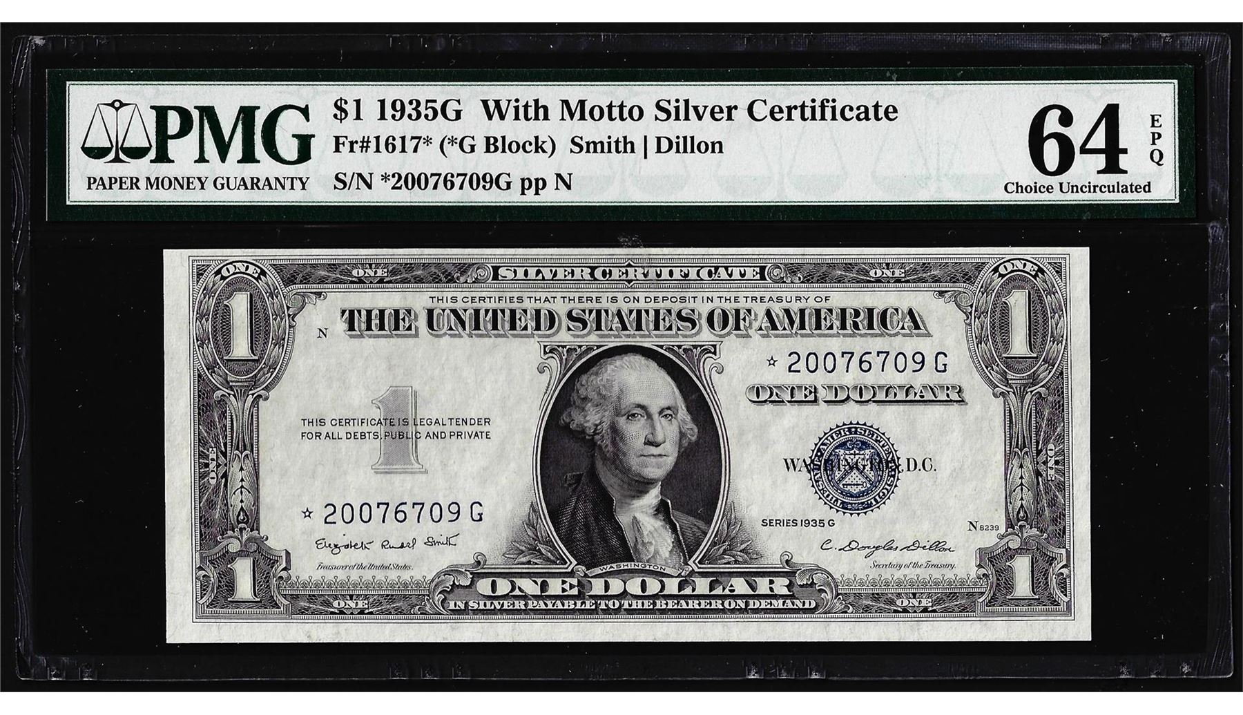 One 1935G $1 Silver Certificate STAR Note Fr.1617* PMG Choice Uncirculated 64EPQ. PMG Certified.