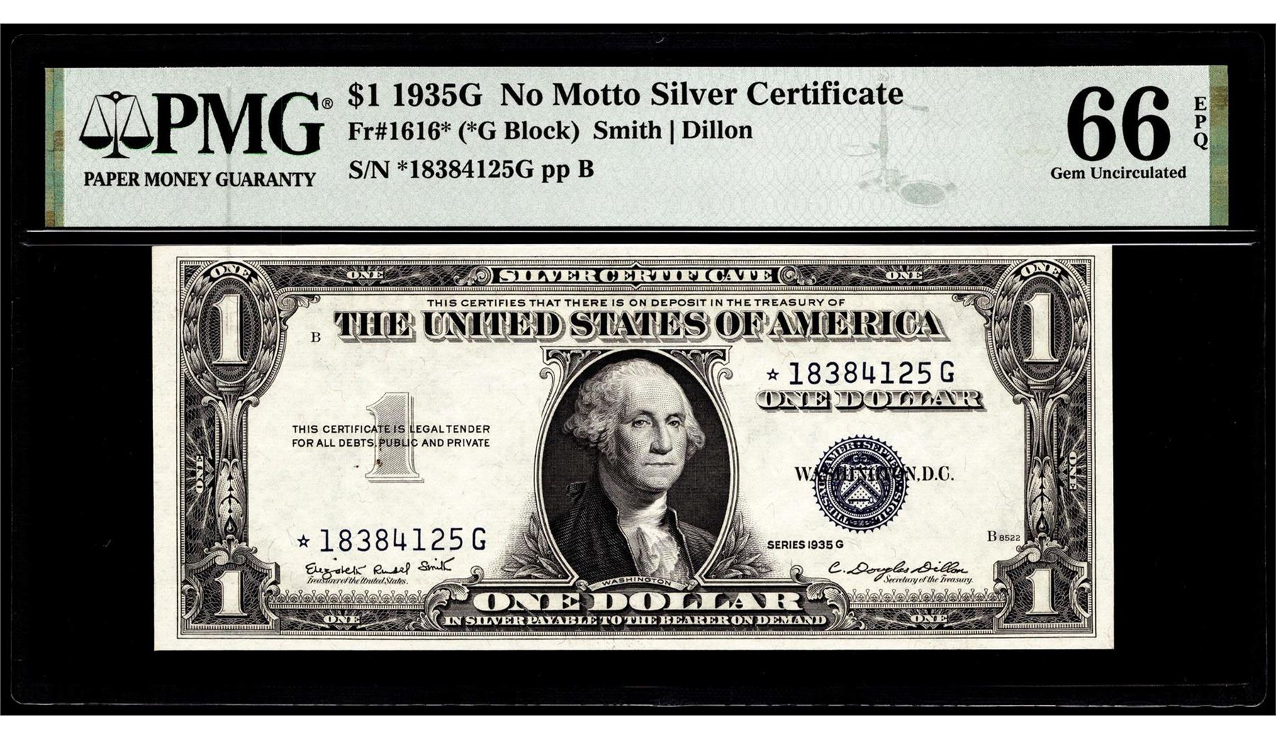 One 1935G No Motto $1 Silver Certificate Star Note Fr.1616* PMG Gem Uncirculated 66EPQ. PMG Certified.
