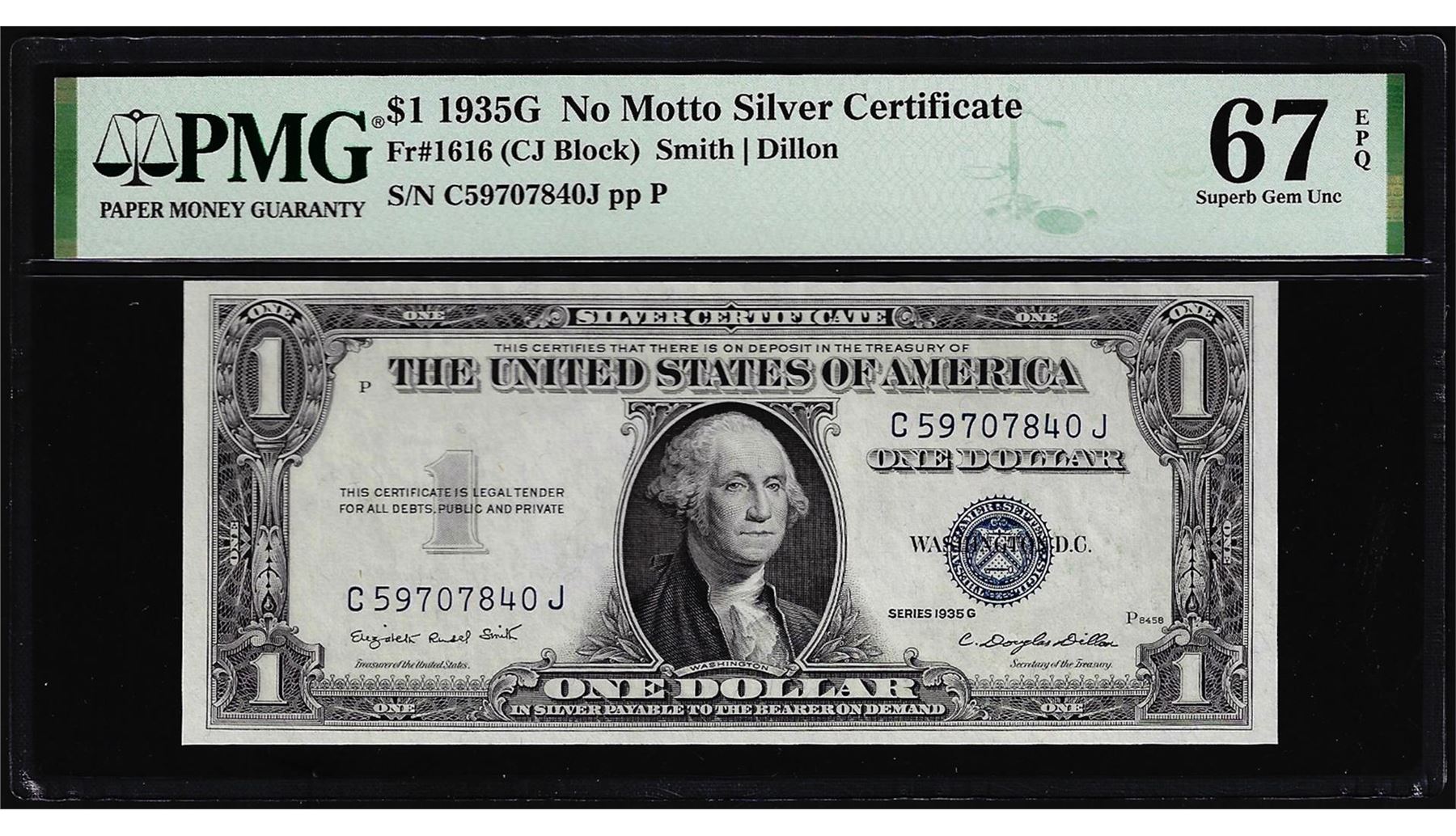 One 1935G No Motto Silver Certificate Note Fr.1616 PMG Superb Gem Uncirculated 67EPQ. PMG Certified.