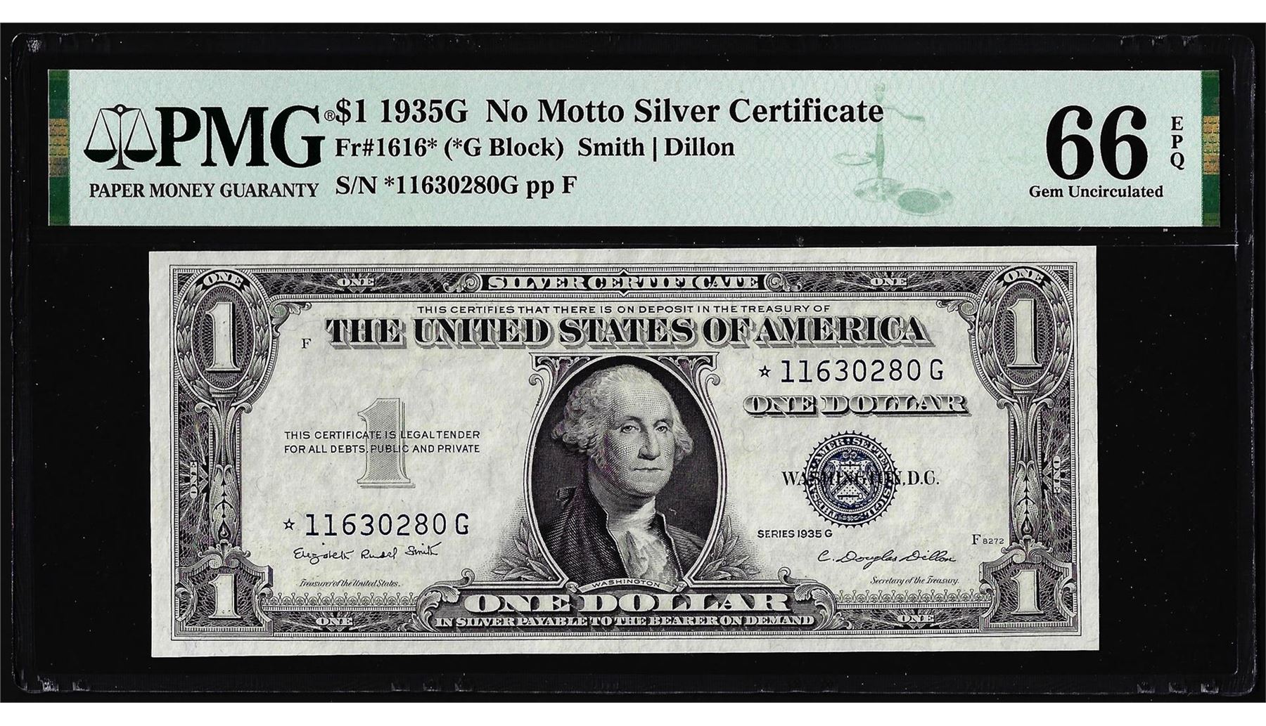 One 1935G No Motto Silver Certificate STAR Note Fr.1616* PMG Gem Uncirculated 66EPQ.