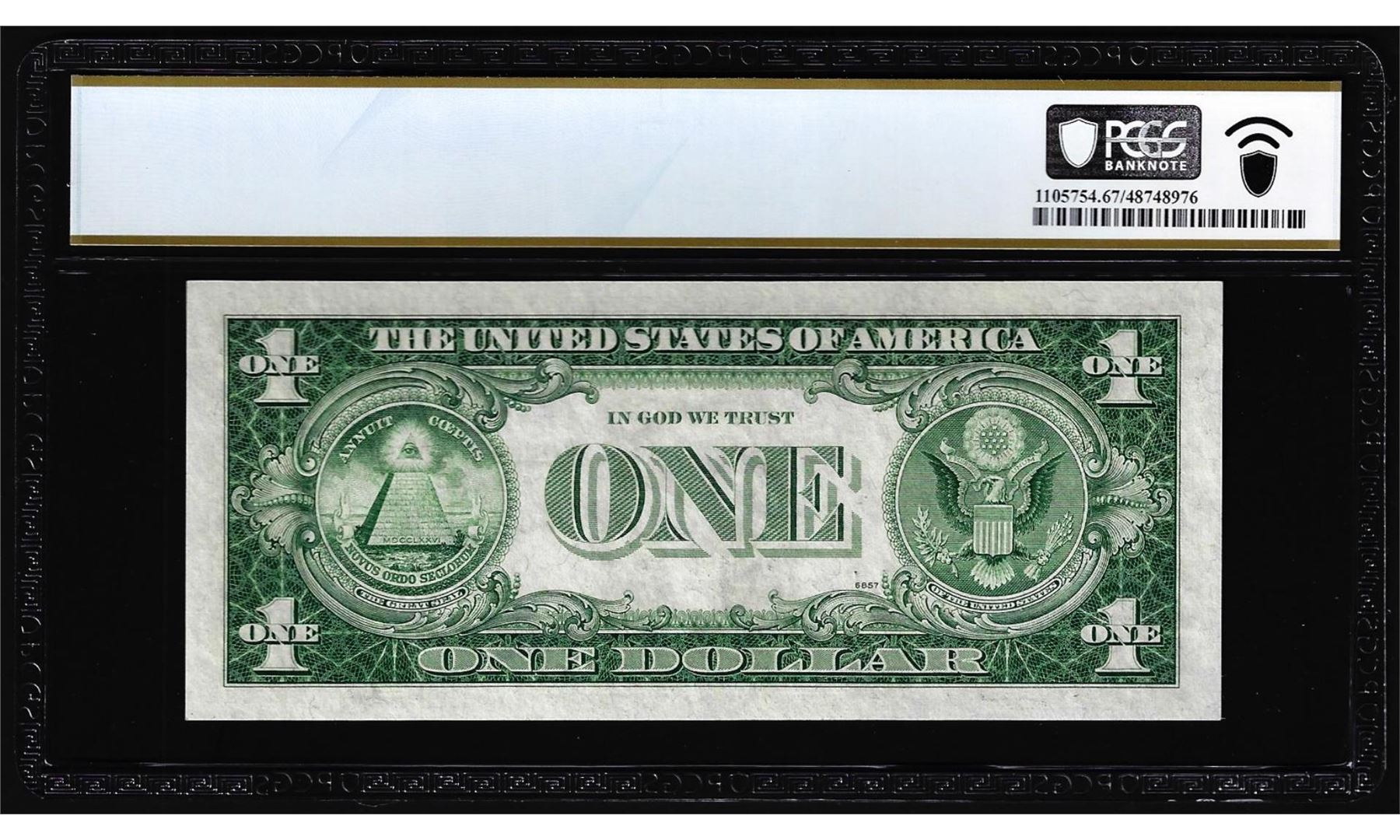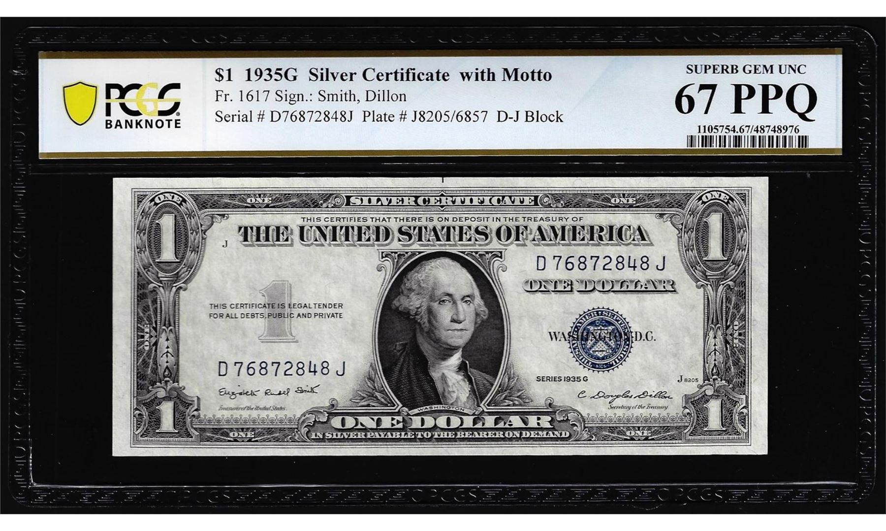 One 1935G with Motto $1 Silver Certificate Note Fr.1617 PCGS Superb Gem Unc 67PPQ. PCGS Graded.